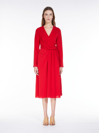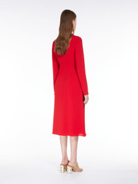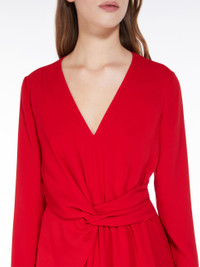 DETAILS Elegant long dress in lightweight cady fabric. The long-sleeved V-neck model boasts refined draped knot detail at the side. Lined model. Length: 118 cm. COMPOSITION AND CARE Fabric 73% triacetate, 27% polyester; lining 70% acetate, 30% polyester. Machine wash cold delicate cycle; do not bleach; do not tumble dry; line drying in the shade; cool iron; professionally dry clean perchloroethylene - mild process. Distributed by Max Mara S.r.l., registered office in Reggio Emilia (Italy), Via Giulia Maramotti 4, 42124 (IT)
