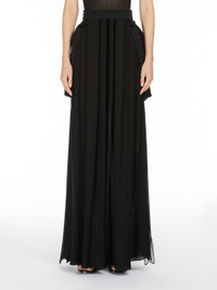 DETAILS Long, straight skirt made of exquisite, lightweight pure silk chiffon with a pure cotton gabardine waistband. Dungaree-inspired model with adjustable gabardine braces that cross over on the back, stitched with on-tone satin-finish metallic rings on the front. Finished with a removable pouch pocket on the front and inset pockets on the sides. Opening with side buttons on both sides. COMPOSITION AND CARE Fabric 100% silk; fabric 2 100% cotton. Do not wash; do not bleach; do not tumble dry; cool iron; professionally dry clean perchloroethylene - mild process; do not wet clean.; put this item into a string bag before washing it.; do not iron the buttons.; turn the articles inside out before washing. Distributed by Max Mara S.r.l., registered office in Reggio Emilia (Italy), Via Giulia Maramotti 4, 42124 (IT)