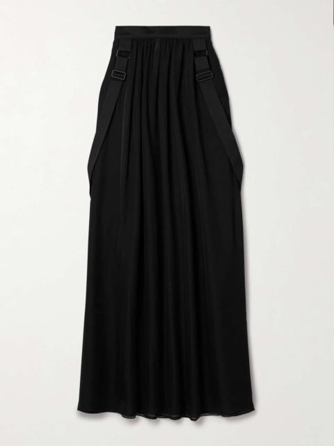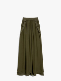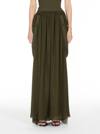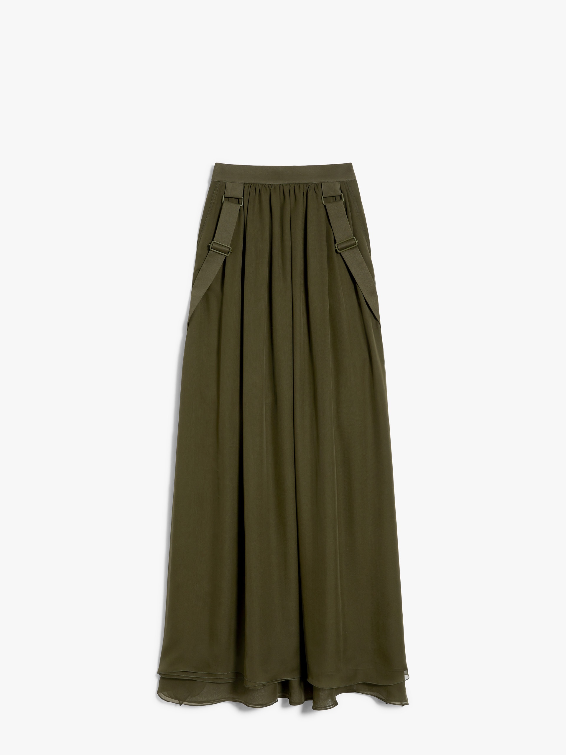 DETAILS Long, straight skirt made of exquisite, lightweight pure silk chiffon with a pure cotton gabardine waistband. Dungaree-inspired model with adjustable gabardine braces that cross over on the back, stitched with on-tone satin-finish metallic rings on the front. Finished with a removable pouch pocket on the front and inset pockets on the sides. Opening with side buttons on both sides. COMPOSITION AND CARE Fabric 100% silk; fabric 2 100% cotton. Do not wash; do not bleach; do not tumble dry; cool iron; professionally dry clean perchloroethylene - mild process; do not wet clean.; put this item into a string bag before washing it.; do not iron the buttons.; turn the articles inside out before washing. Distributed by Max Mara S.r.l., registered office in Reggio Emilia (Italy), Via Giulia Maramotti 4, 42124 (IT)