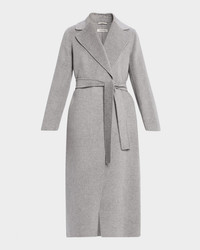 Luxuriously handsewn wool and cashmere Max Mara coat with a matching belt to envelop the long, fluid form Notched collar; wrap front Long sleeves; vented cuffs Selftie belt Onseam side pockets Streamlined cut Walking back slit Virgin wool/cashmere Dry clean Imported