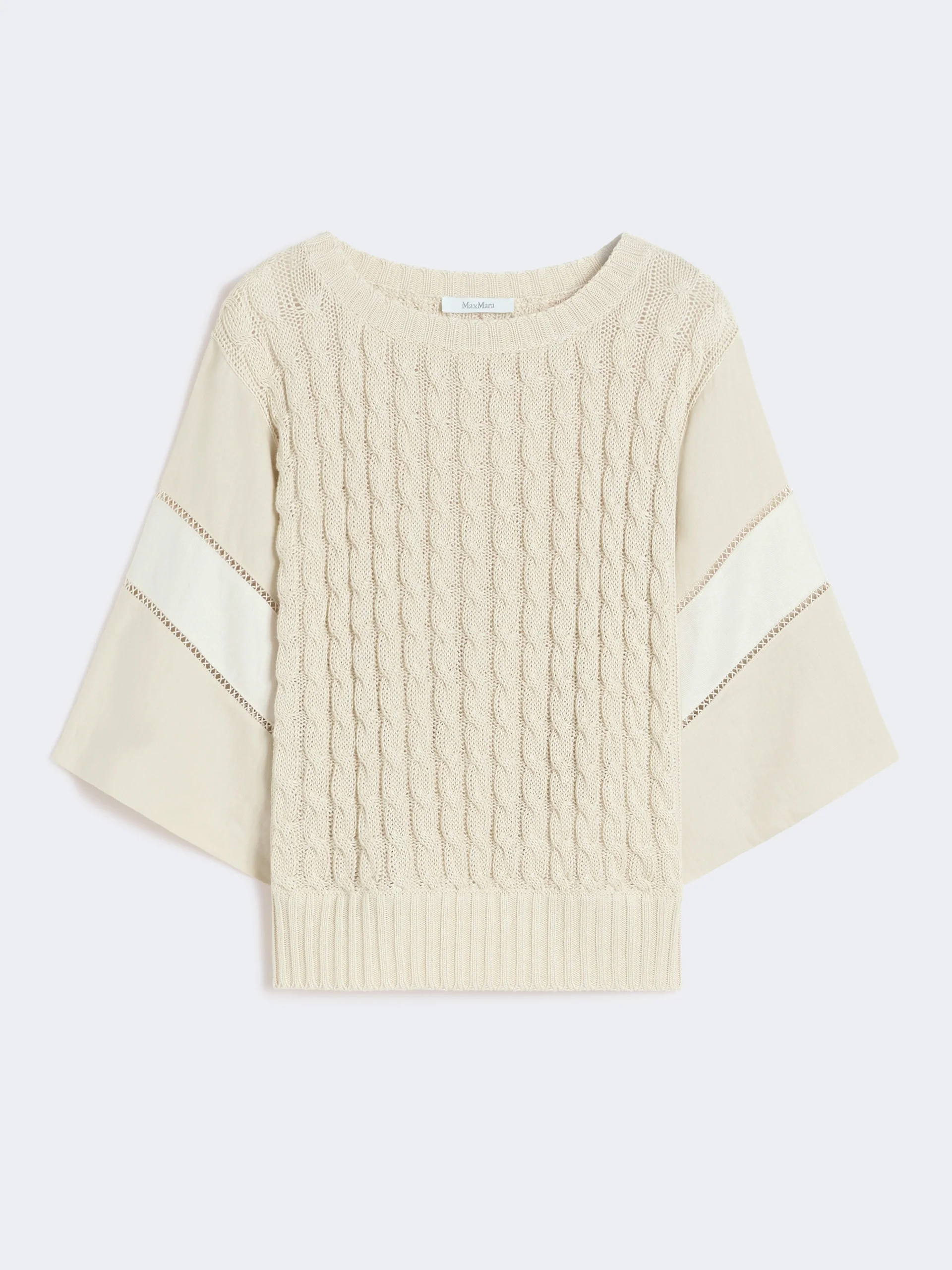 DETAILS Boxy jumper, featuring lightweight pure linen canvas inserts with openwork details on the sleeves. - Cable-knit pure linen yarn sweater - Loose fit - Crew-neck - Short kimono sleeves - Straight hem - Ribbed edges COMPOSITION AND CARE Knitted fabric 100% flaxlinen; fabric 100% flaxlinen. Hand wash cold (40°c max); do not bleach; do not tumble dry; flat drying in the shade; cool iron; professionally dry clean perchloroethylene - mild process; do not wet clean.; iron with a cloth between.; using neutral detergent. Distributed by Max Mara S.r.l., registered office in Reggio Emilia (Italy), Via Giulia Maramotti 4, 42124 (IT) Collection: Max Mara Product code: 1361016206001 - MXMSCATOLA