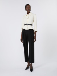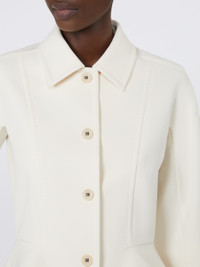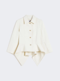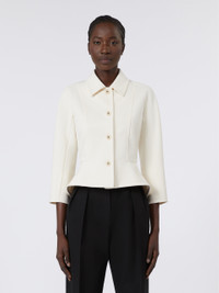 DETAILS Single-breasted jacket featuring a peplum construction with asymmetrical flounce on the back. Jacket in double-layer sable Fitted and feminine Shirt collar Set-in sleeves with small cuff slits and button Four-button front fastening Tailored pick stitch and seam motif at waist and hips Lined COMPOSITION AND CARE Fabric 90% polyester, 10% elastane; lining 65% acetate, 35% polyester. Do not wash; do not bleach; do not tumble dry; cool iron; professionally dry clean perchloroethylene - mild process; do not wet clean.; wash the garment while it is fastened.; do not iron the buttons.; protect buttons before washing.; turn the articles inside out before washing.; contains non-textile parts of animal origin. Distributed by Max Mara S.r.l., registered office in Reggio Emilia (Italy), Via Giulia Maramotti 4, 42124 (IT)
