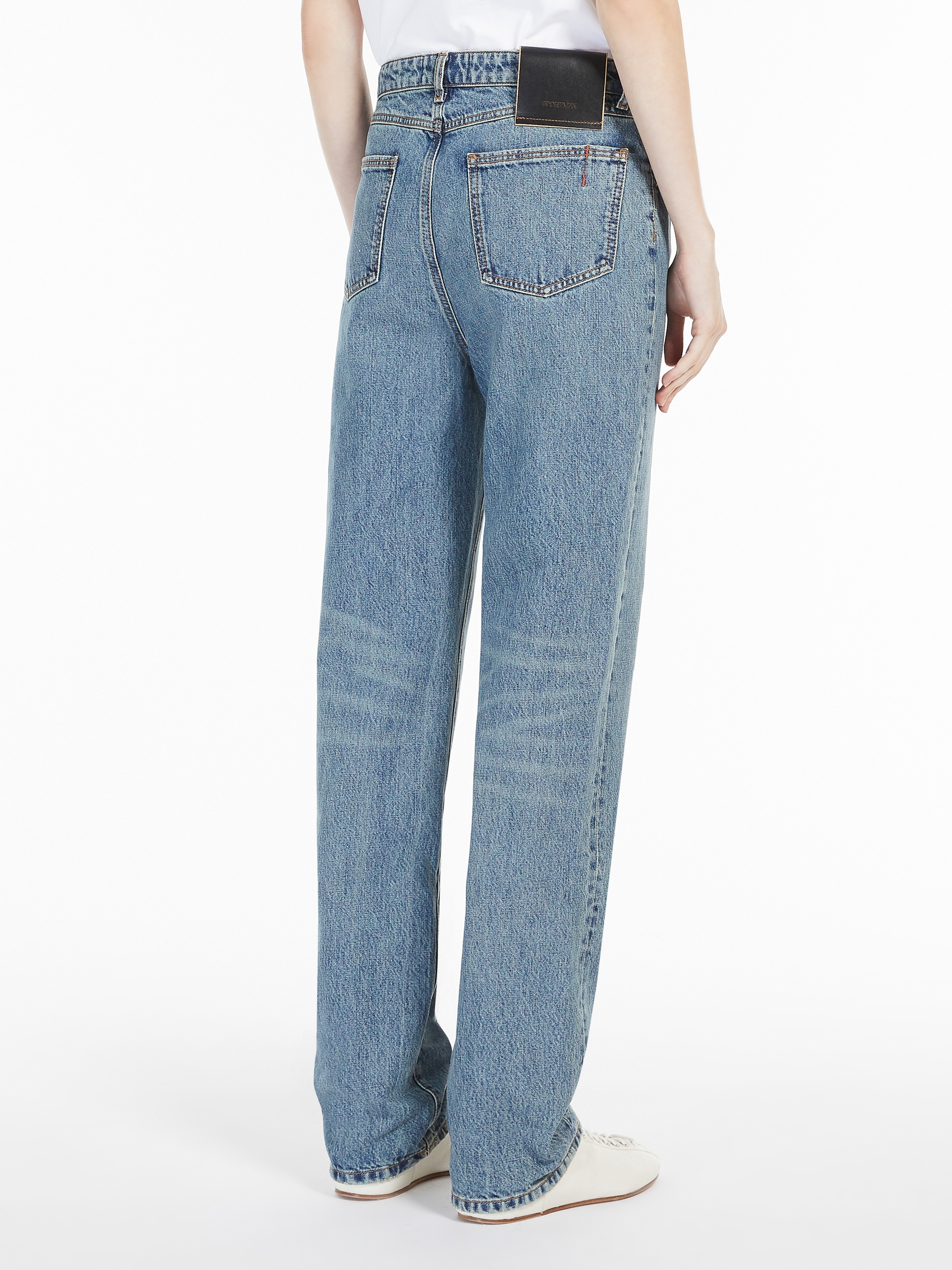 DETAILS Five-pocket jeans in indigo authentic denim, garment-dyed dark worn and medium vintage treatment. Low-rise waist with wide, straight leg. Metal snap fastening and tobacco stitching. Additional details are the embossed leather logo label and contrasting stitching on the pocket for a pen holder effect. COMPOSITION AND CARE 100% cotton. Machine wash cold delicate cycle; do not bleach; do not tumble dry; line drying in the shade; cool iron; do not dry clean.; don’t iron the labels.; do not iron the buttons.; take care when wearing light-coloured clothes or accessories because, with the heat of the body, the indigo fabric , may fade and stain. be careful while sitting on light coloured surfaces, especially if wet. wash garments separately and always turned inside out. hang the garment turned inside out by avoiding to expose it to direct sunlight. avoid removing isolated stains.; contains non-textile parts of animal origin. Distributed by Max Mara S.r.l., registered office in Reggio Emilia (Italy), Via Giulia Maramotti 4, 42124 (IT)