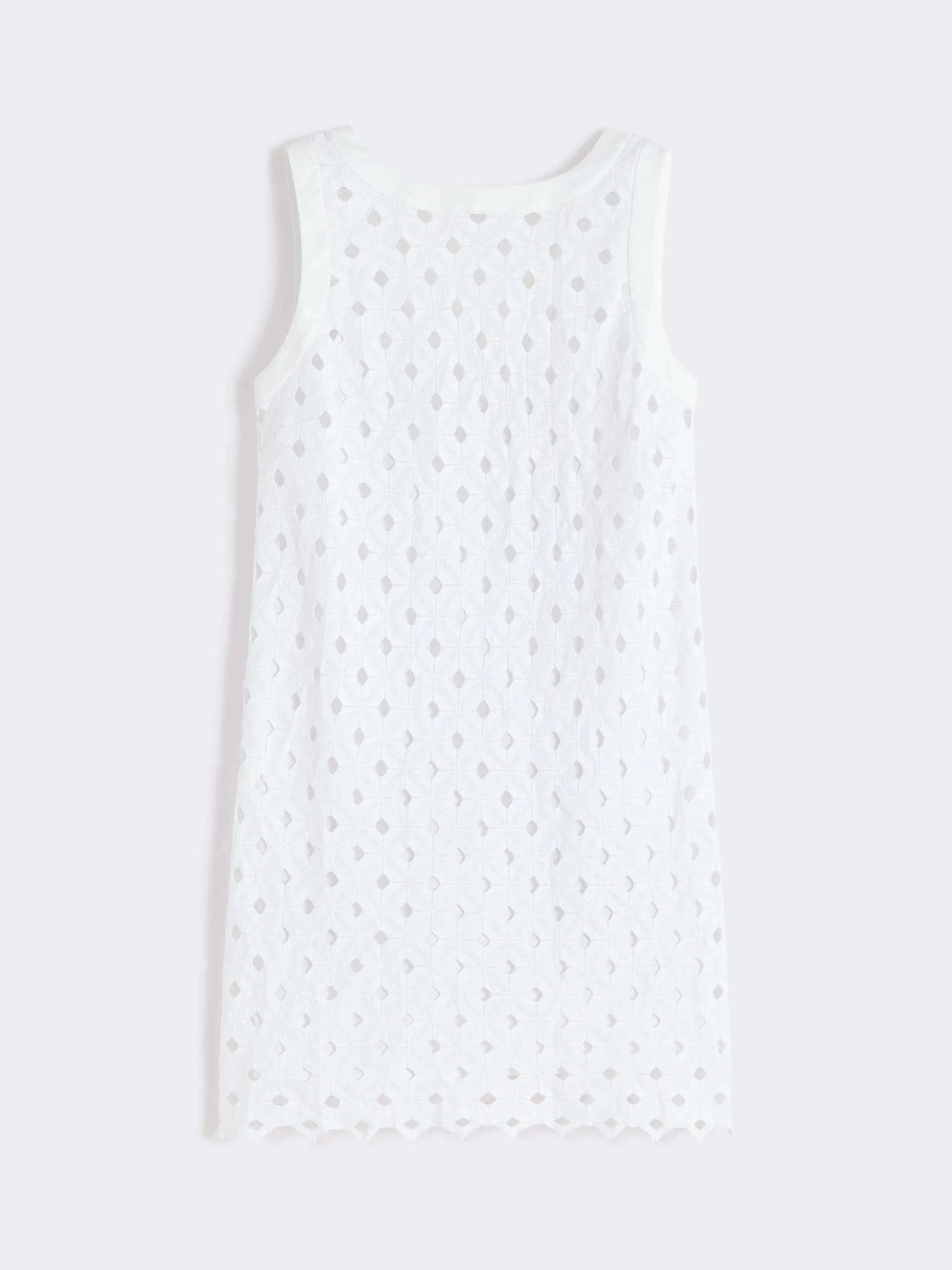 DETAILS Short, sleeveless dress, fully woven with a see-through-effect geometric macrame motif. - Regular fit - Cotton-blend jersey dress - Flared A-line cut - Boat-neck front and V-neck back - Wide shoulder straps with plain-coloured poplin armholes - Removable slip with securing strap and small button - Raw-cut garment hem COMPOSITION AND CARE Jersey dress 70% polyester, 30% cotton. Petticoat 95% cotton, 5% elastane. Jersey dress: hand wash cold (40°c max); do not bleach; do not tumble dry; flat drying in the shade; cool iron; professionally dry clean perchloroethylene - mild process; do not wet clean.; Iron with a cloth between.; Using neutral detergent. Petticoat: hand wash cold (40°c max); do not bleach; do not tumble dry; flat drying in the shade; cool iron; professionally dry clean perchloroethylene - mild process; do not wet clean.; Iron with a cloth between.; Using neutral detergent. Distributed by Max Mara S.r.l., registered office in Reggio Emilia (Italy), Via Giulia Maramotti 4, 42124 (IT) Collection: Beachwear Product code: 6621086906001 - BCHPESI
