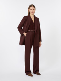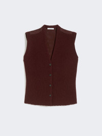 DETAILS Gilet with ribbed knit on the front and asymmetrical hem that is slightly shorter on the back. Wool and cashmere yarn gilet Slim fit V neck Front fastening with custom horn buttons Insert bonded in stretch jacquard Monogram satin on the back Strap with metal buckle on the waist back COMPOSITION AND CARE Knitted fabric 67% wool, 29% cashmere, 3% polyamide, 1% elastane; fabric 65% acetate, 35% polyester; lining 65% acetate, 35% polyester. Do not wash; do not bleach; do not tumble dry; cool iron; professionally dry clean perchloroethylene - mild process; do not wet clean.; iron with a cloth between. Distributed by Max Mara S.r.l., registered office in Reggio Emilia (Italy), Via Giulia Maramotti 4, 42124 (IT)