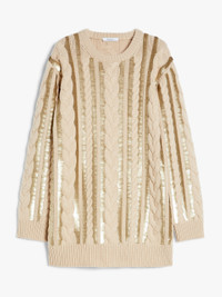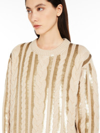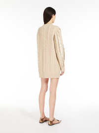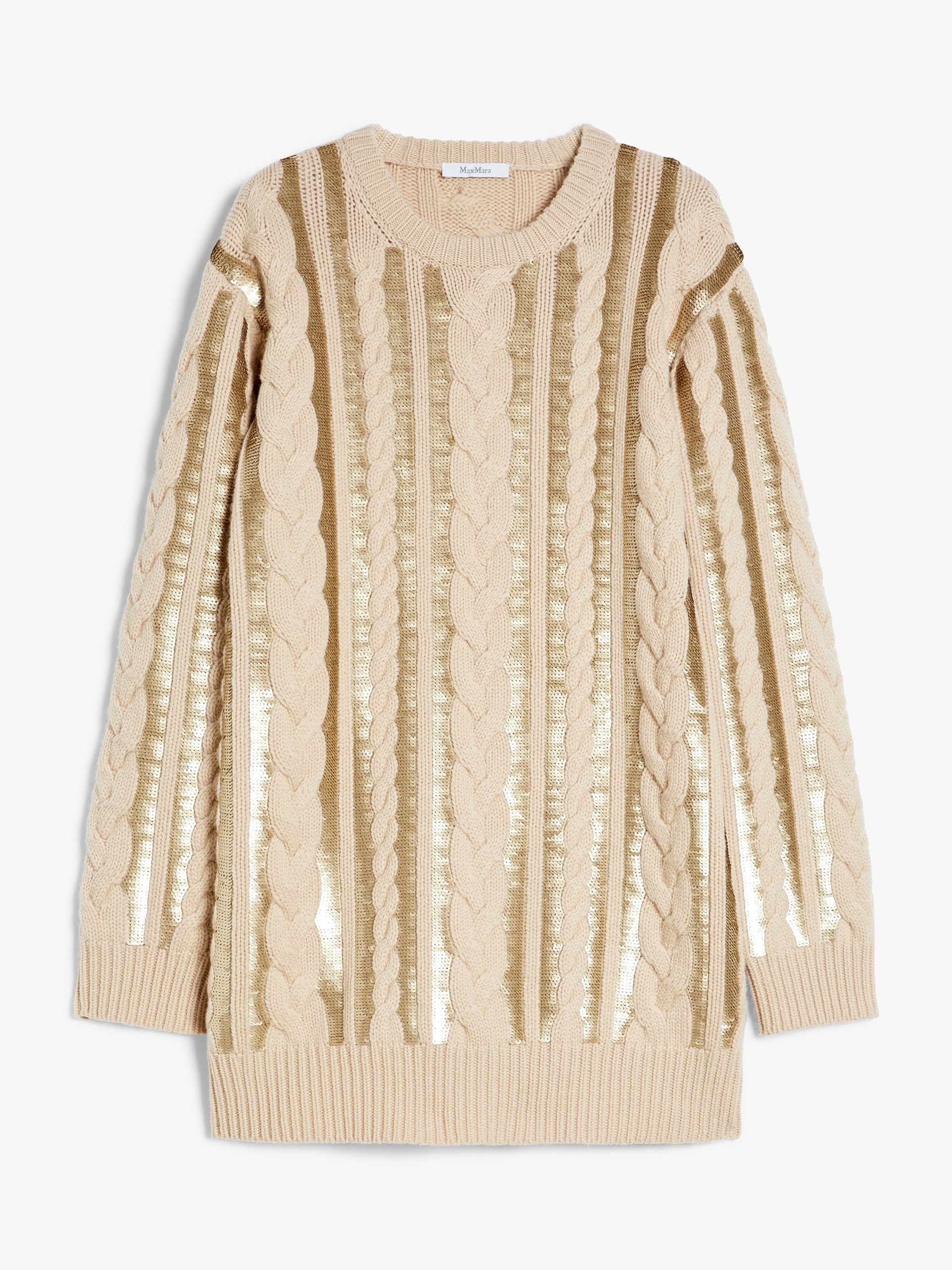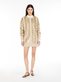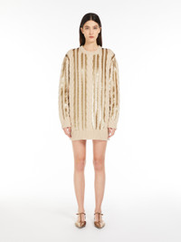 DETAILS Short dress in luxurious wool and cashmere yarn, with a round neckline and long dropped-shoulder sleeves. Straight-line style, embellished with matching sequins embroidered on the front and sleeves. Finished with ribbed edges. COMPOSITION AND CARE Knitted fabric 70% wool, 30% cashmere; joining thread 100% polyester; - exclusive of decoration. Do not wash; do not bleach; do not tumble dry; cool iron; professionally dry clean perchloroethylene - mild process; do not wet clean.; iron with a cloth between.; do not iron the decoration. Distributed by Max Mara S.r.l., registered office in Reggio Emilia (Italy), Via Giulia Maramotti 4, 42124 (IT)