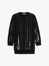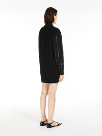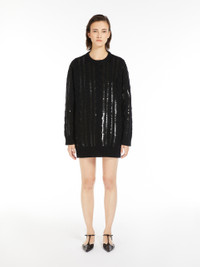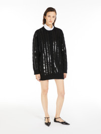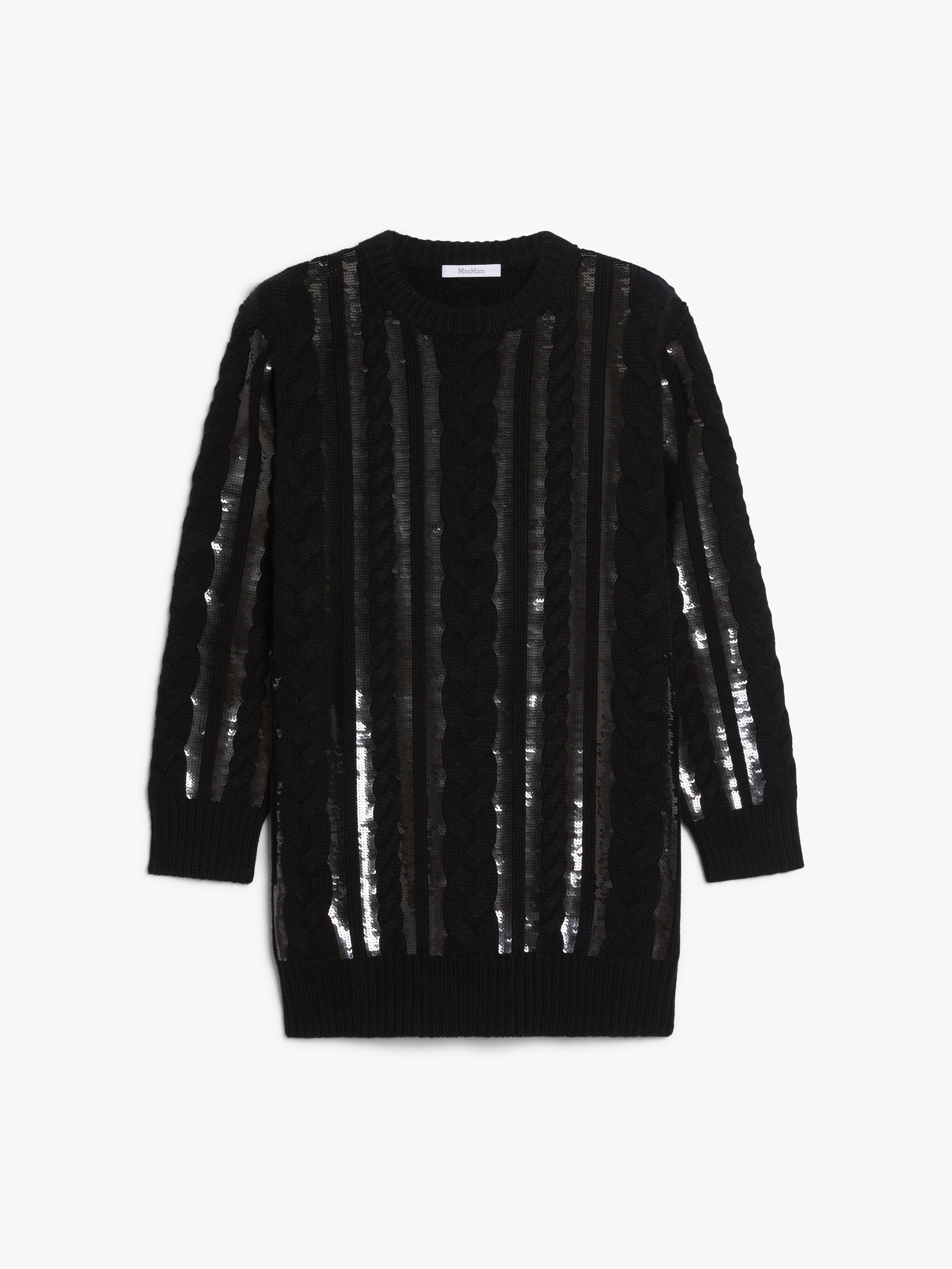 DETAILS Short dress in luxurious wool and cashmere yarn, with a round neckline and long dropped-shoulder sleeves. Straight-line style, embellished with matching sequins embroidered on the front and sleeves. Finished with ribbed edges. COMPOSITION AND CARE Knitted fabric 70% wool, 30% cashmere; joining thread 100% polyester; - exclusive of decoration. Do not wash; do not bleach; do not tumble dry; cool iron; professionally dry clean perchloroethylene - mild process; do not wet clean.; iron with a cloth between.; do not iron the decoration. Distributed by Max Mara S.r.l., registered office in Reggio Emilia (Italy), Via Giulia Maramotti 4, 42124 (IT)