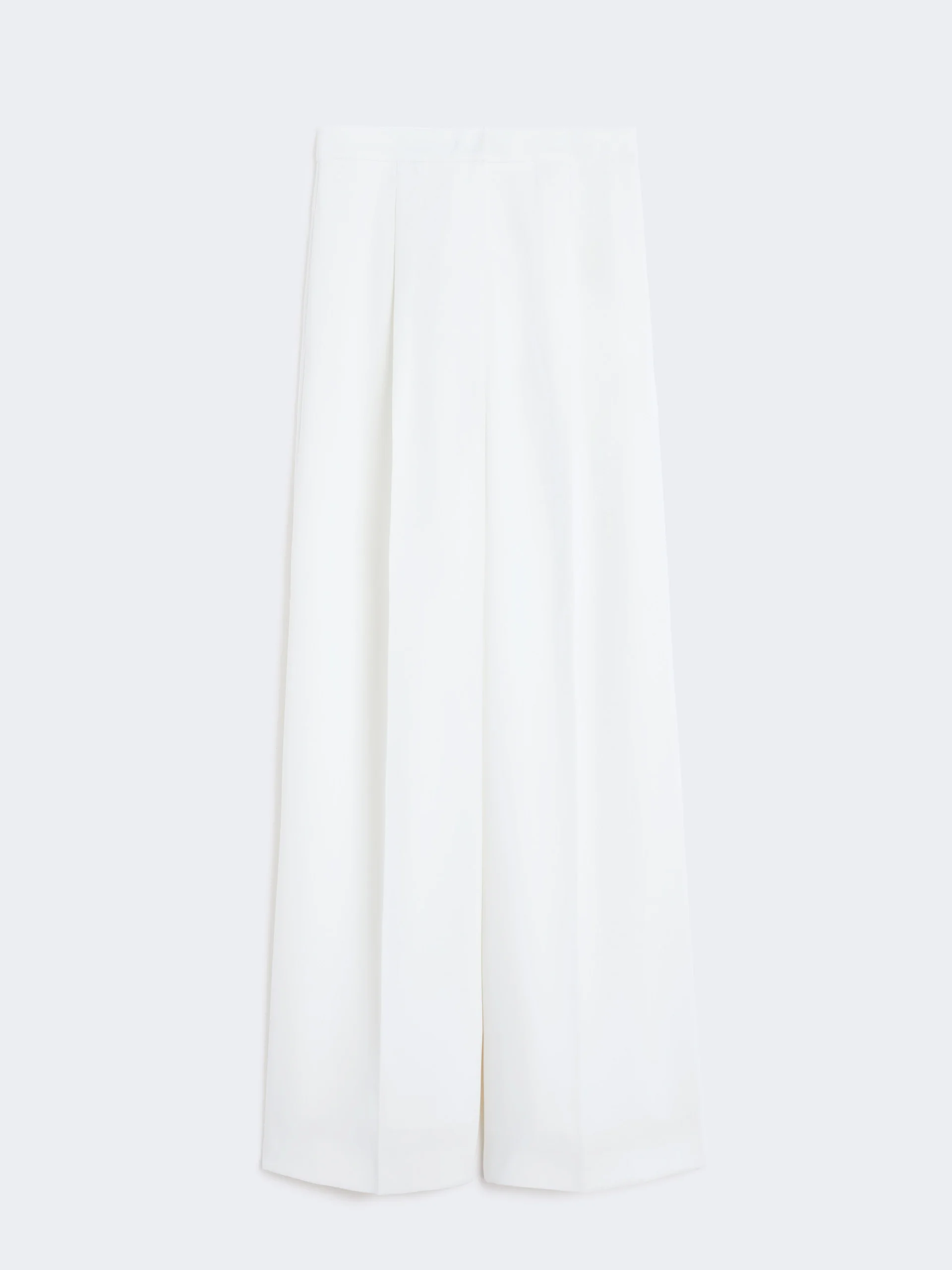 DETAILS Long trousers featuring a relaxed silhouette with wide legs. - Compact cady trousers - Loose fit with front darts - Fastening with a wide waistband tab, zip fly and small hook - Side inset pockets - Trouser crease and darts sewn at the waist back COMPOSITION AND CARE Fabric 65% triacetate, 35% polyester; lining 95% acetate, 5% elastane. Machine wash cold delicate cycle; do not bleach; do not tumble dry; line drying in the shade; cool iron; professionally dry clean perchloroethylene - mild process.; protect buttons before washing. Distributed by Max Mara S.r.l., registered office in Reggio Emilia (Italy), Via Giulia Maramotti 4, 42124 (IT)