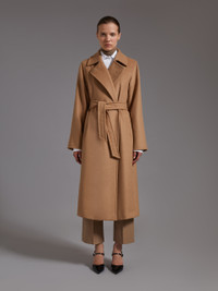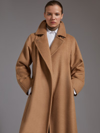DETAILS Since 1998, the Manuela robe coat, crafted from sable-look pure camel fabric and designed by Anne-Marie Beretta, has epitomised Max Mara's passion for everyday-suitable quality and laid-back luxury. The by-now iconic model is both seasonless and timeless. Made from sable-look pure camel broadcloth Straight fit Embellished with tailoring-style hand-stitched detail Wide lapel collar with a 2-in-1 button Shirt-style armholes with a kimono sleeve cut Side dart-inset pockets Matching belt Branded lining Length: 115 cm/4.5 inches COMPOSITION AND CARE Fabric 100% camelwool; lining 100% viscose. Do not wash; do not bleach; do not tumble dry; cool iron; professionally dry clean perchloroethylene - mild process; do not wet clean. Distributed by Max Mara S.r.l., registered office in Reggio Emilia (Italy), Via Giulia Maramotti 4, 42124 (IT)