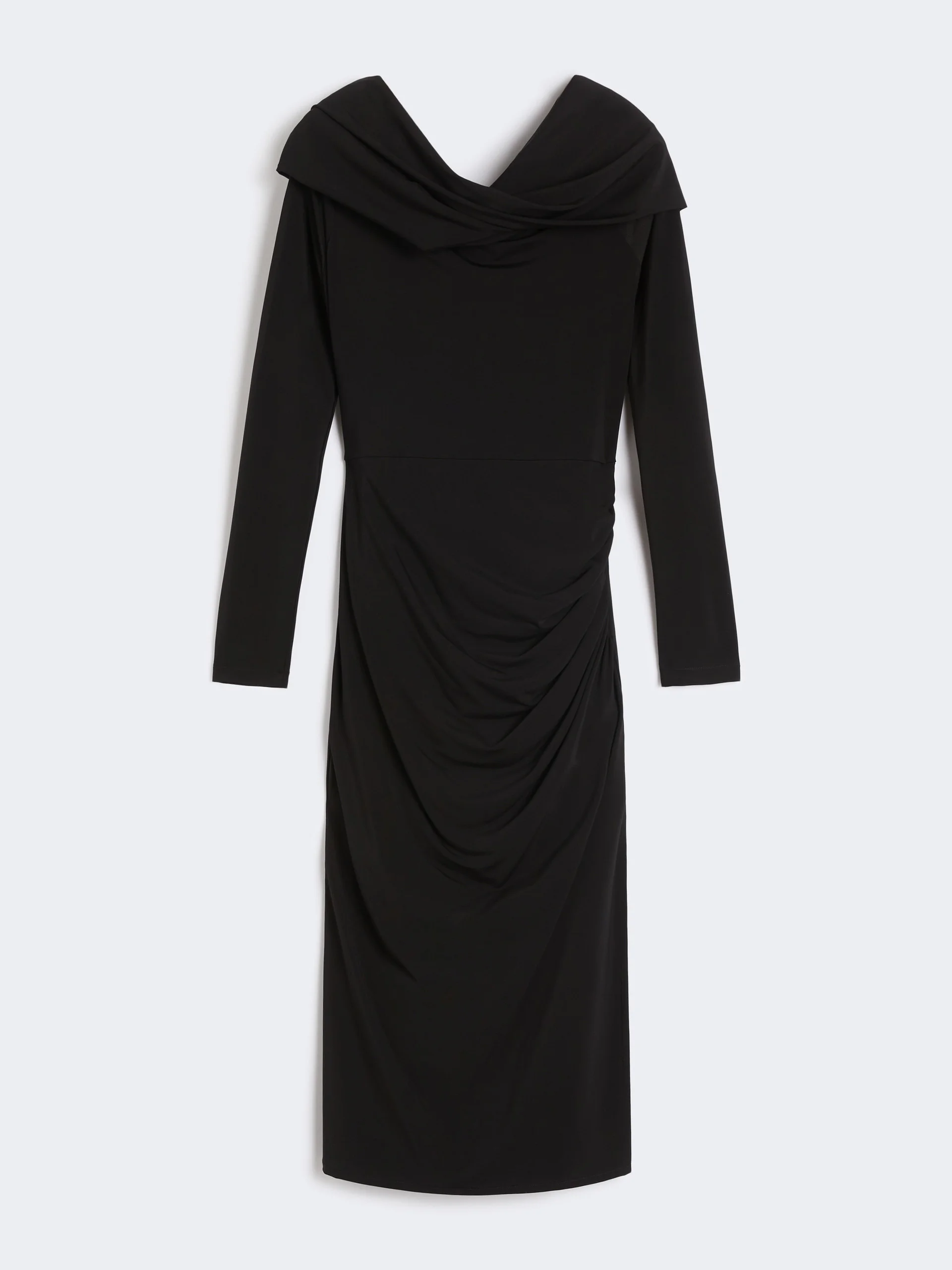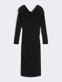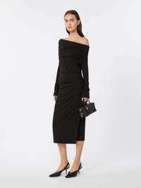 DETAILS Midi dress with folded straight neckline and an off-the-shoulder effect. Stretch viscose jersey dress Figure-hugging Long glove-style sleeves Wrap-style pencil skirt with slit Asymmetrical gathered motif on the left side COMPOSITION AND CARE Jersey fabric 91% viscose, 9% elastane; bust lining 94% polyamide, 6% elastane. Machine wash cold delicate cycle; do not bleach; do not tumble dry; flat drying in the shade; cool iron; professionally dry clean perchloroethylene - mild process; professional wet cleaning - very mild process.; iron with a cloth between.; using neutral detergent. Distributed by Max Mara S.r.l., registered office in Reggio Emilia (Italy), Via Giulia Maramotti 4, 42124 (IT)
