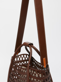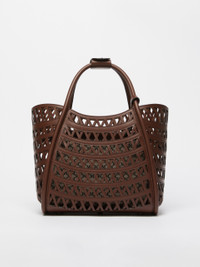 DETAILS Woven leather small Marine bag. This exclusive creation has a distinctive rounded shape and versatile dimensions thanks to the foldable sides with an internal strap and ring. The iconic tubular handles, with a loop to attach them, and the removable adjustable strap allow it to be carried by hand or worn on the shoulder or crossbody. Unlined design with a see-through effect, including a removable flat fabric pouch featuring a jacquard M Monogram pattern, complete with a zip and leather details. Finished with Max Mara metallic lettering applied to the front and five metallic feet. Magnetic top fastening. Measurements: 35 x 20 x 24 cm. COMPOSITION AND CARE Handbag handbag in cattle; lining in 50 nylon, 50 polyurethane. Bag handbag in cotton; with details in calf; inside in lamb leather. Distributed by Max Mara S.r.l., registered office in Reggio Emilia (Italy), Via Giulia Maramotti 4, 42124 (IT)