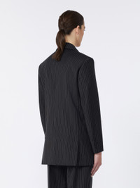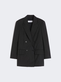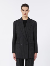 DETAILS Double-breasted blazer with straight lines, slightly elongated at the hip. - Pinstriped blazer in yarn-dyed, lightweight pure wool canvas - Collar with peak lapels - Set-in sleeves with buttoned cuffs - Button fastening - Chest pocket and welt pockets with flap on the front - Side slits at the back - Monogram jacquard customisation on the lining COMPOSITION AND CARE Fabric 100% virgin wool; lining 65% acetate, 35% polyester. Do not wash; do not bleach; do not tumble dry; cool iron; professionally dry clean perchloroethylene - mild process; do not wet clean.; do not iron the buttons.; protect buttons before washing.; contains non-textile parts of animal origin. Distributed by Max Mara S.r.l., registered office in Reggio Emilia (Italy), Via Giulia Maramotti 4, 42124 (IT)