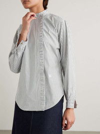 Max Mara's 'Didy' shirt is traced with ruffled trims along the placket and collar, bringing a feminine edge to the striped cotton-blend poplin cloth. Finished with logo embroidery above the hem, it has blouson sleeves and neat barrel cuffs. Style yours under a blazer or crew-neck sweater. Size & Fit - Fits true to size, take your normal size - Designed for a slightly loose fit - Mid-weight, slightly stretchy fabric - Model is 180cm/ 5'11" and is wearing a UK 8 Model measurements: - Bust: 78cm/ 31" - Waist: 65cm/ 25.5" - Hip: 90cm/ 35.5" Details & Care - White and gray cotton-blend poplin - Button fastenings through front - 97% cotton, 3% elastane - Dry clean