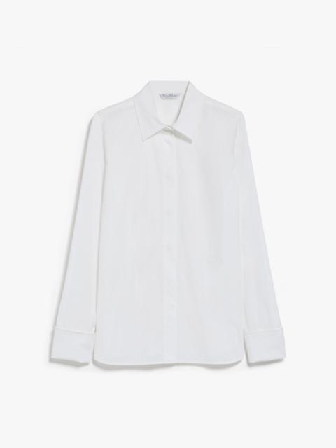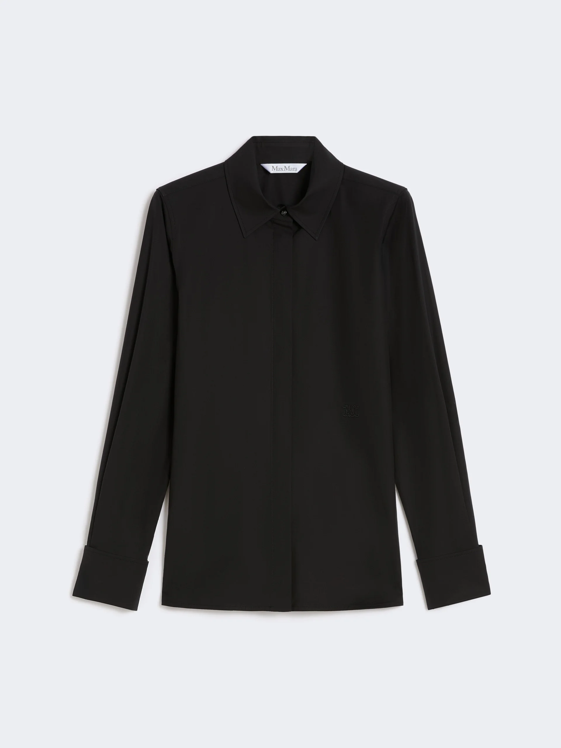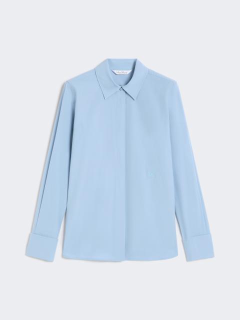 DETAILS Semi-fitted mannish-style shirt. Stretch cotton poplin shirt Pointed collar Long set-in sleeves with double cuff detail Covered-button fastening on the front Small embroidered M Monogram detail on the front, left-hand side Pleated darted yoke at the back Rounded side slits COMPOSITION AND CARE 97% cotton, 3% elastane. Machine wash cold delicate cycle; do not bleach; do not tumble dry; line drying in the shade; cool iron; professionally dry clean perchloroethylene - mild process.; wash the garment while it is fastened.; turn the articles inside out before washing.; remove the cufflinks before washing.; contains non-textile parts of animal origin. Distributed by Max Mara S.r.l., registered office in Reggio Emilia (Italy), Via Giulia Maramotti 4, 42124 (IT)