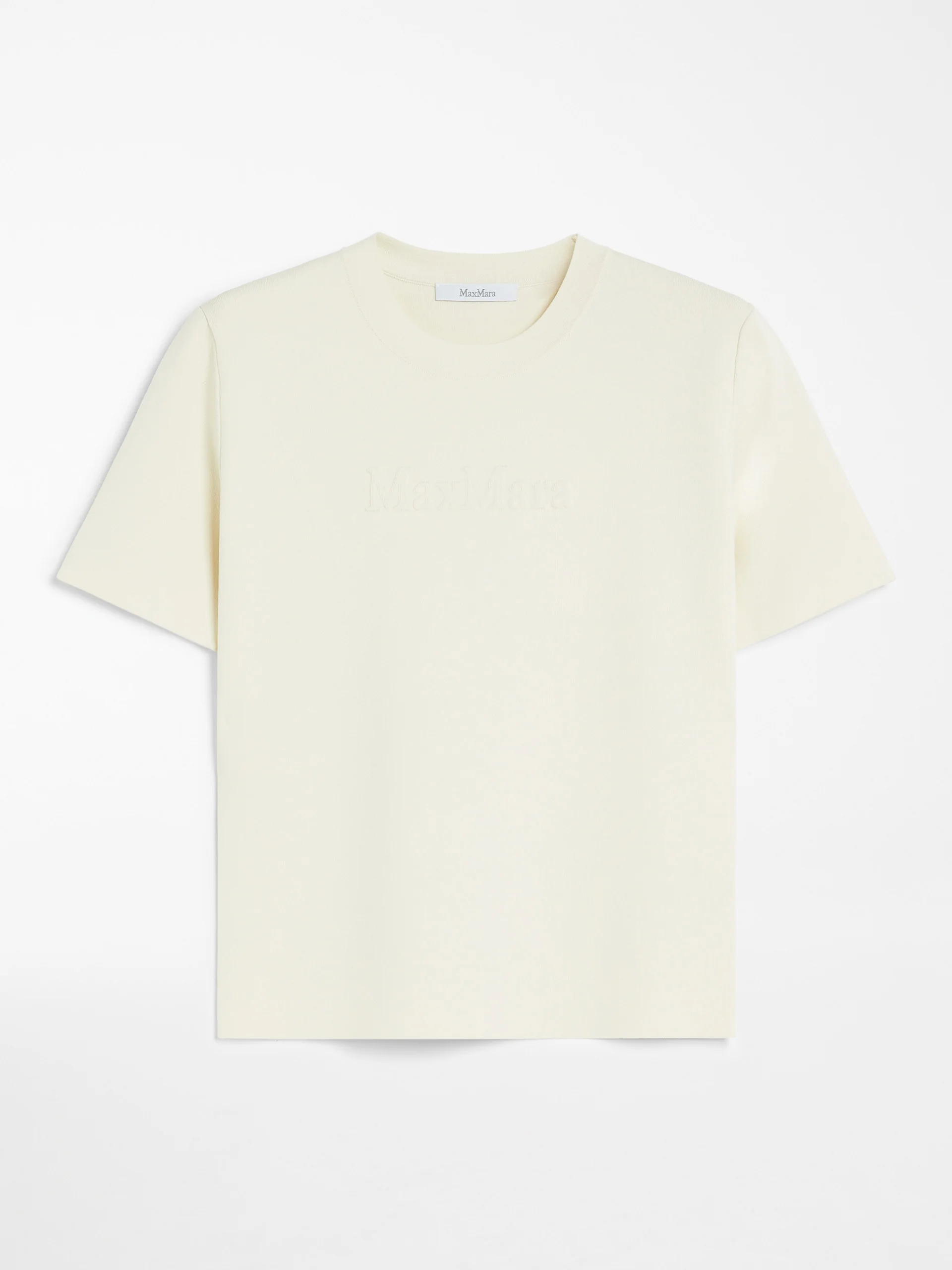 DETAILS Jumper in soft viscose crepe interlock yarn, with round neck and short sleeves. Semi-fitted garment customised with heat-printed logo on the front, three-dimensional effect. COMPOSITION AND CARE 65% viscose, 35% polyamide. Hand wash cold; do not bleach; do not tumble dry; flat drying in the shade; cool iron; professionally dry clean perchloroethylene - mild process; do not wet clean.; iron with a cloth between.; using neutral detergent. Distributed by Max Mara S.r.l., registered office in Reggio Emilia (Italy), Via Giulia Maramotti 4, 42124 (IT)