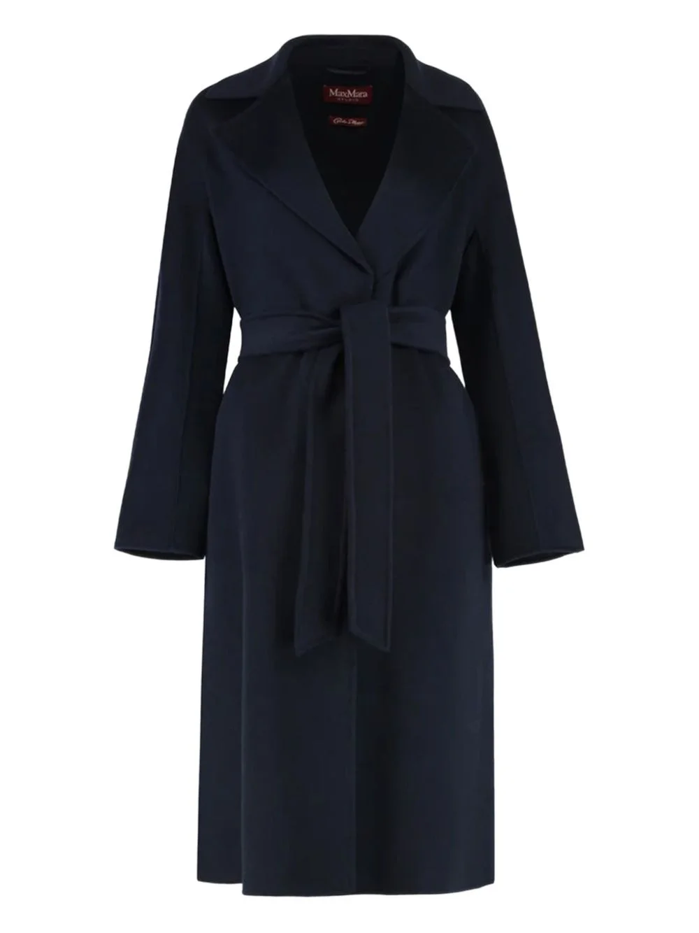 belted coat Highlights - Navy blue - Self-tie belt - Notched lapels - Long sleeves - A-line shape Imported Composition Wool 88%, Silk 6%, Cashmere 6% Washing instructions Read Manufacturer Guidelines