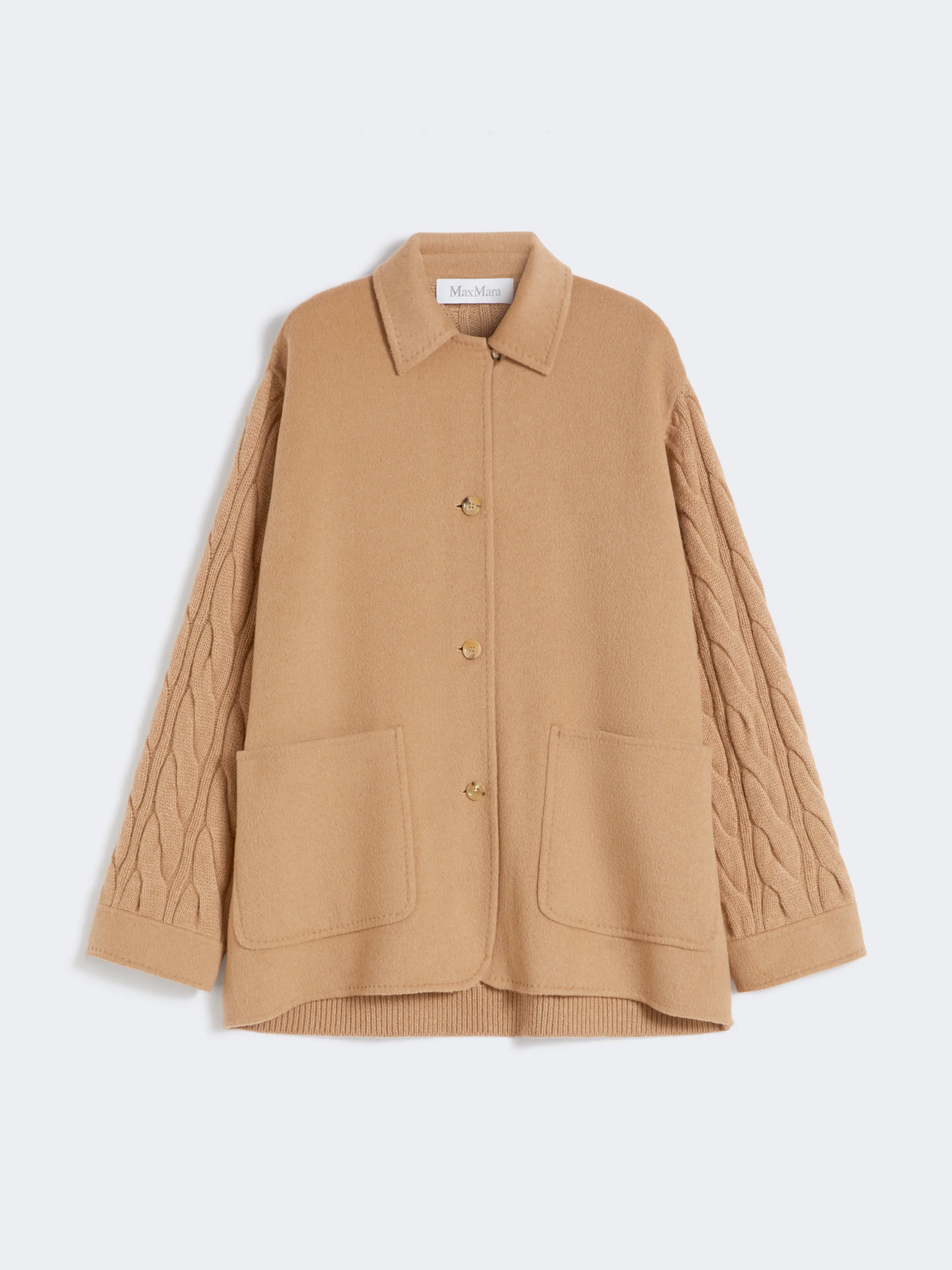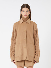 DETAILS Overshirt jacket with sleeves and back knitted in a combination of cable and rib stitches. Jacket in pure camel double fabric Oversized lines Shirt collar and cuffs Front fastening with visible buttons Patch pockets on the front Leather logo plate on the back of the neck Slightly overlapping side slits COMPOSITION AND CARE Knitted fabric 100% camelwool; fabric 100% camelwool. Do not wash; do not bleach; do not tumble dry; cool iron; professionally dry clean perchloroethylene - mild process; do not wet clean.; iron with a cloth between. Distributed by Max Mara S.r.l., registered office in Reggio Emilia (Italy), Via Giulia Maramotti 4, 42124 (IT)