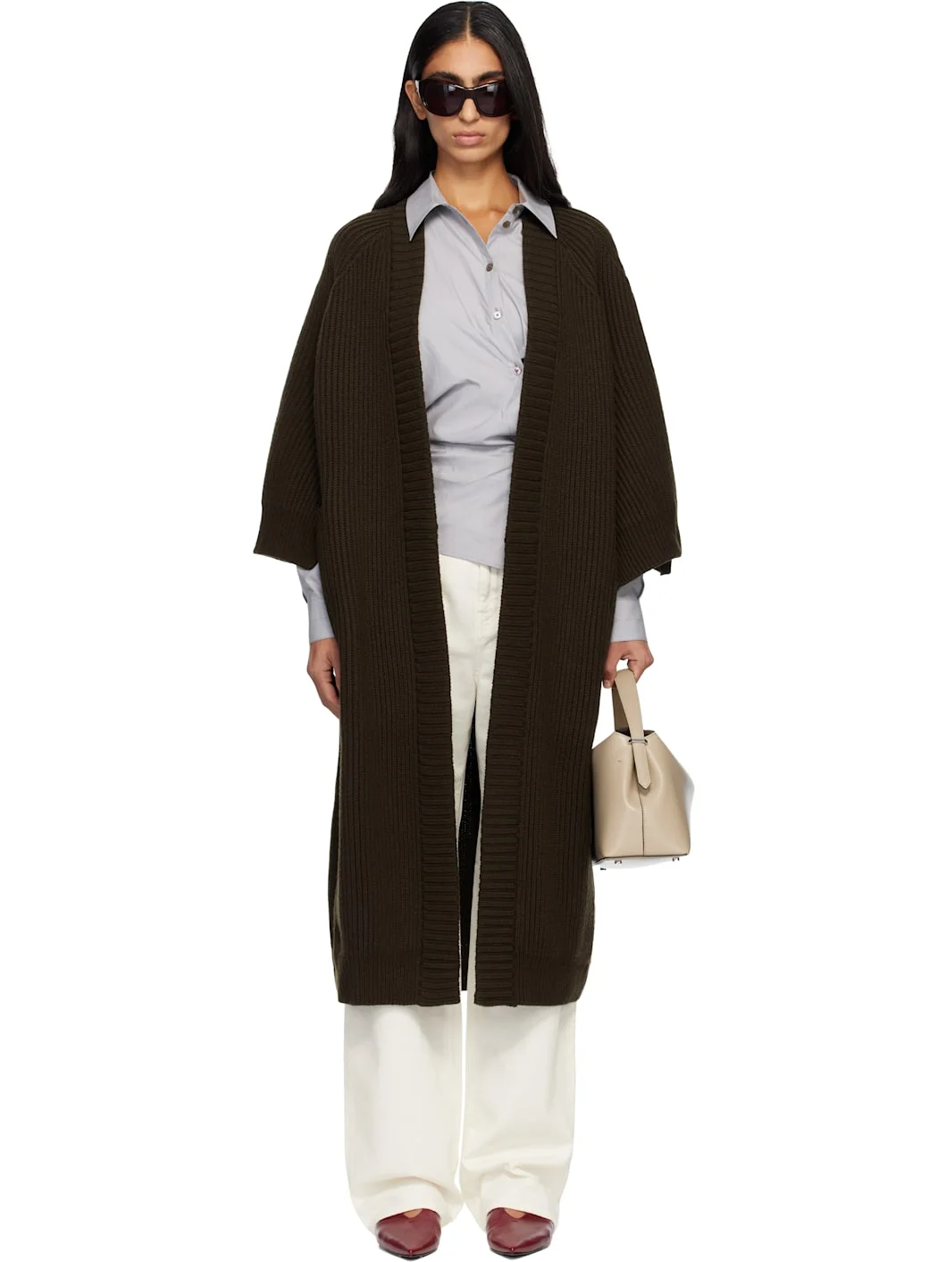 Rib-knit wool- and cashmere-blend cardigan. · Shawl collar · Open front · Patch pockets at waist · Raglan sleeves Supplier color: Moss green 70% wool, 30% cashmere. Made in Romania 252118F095005