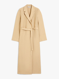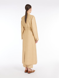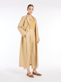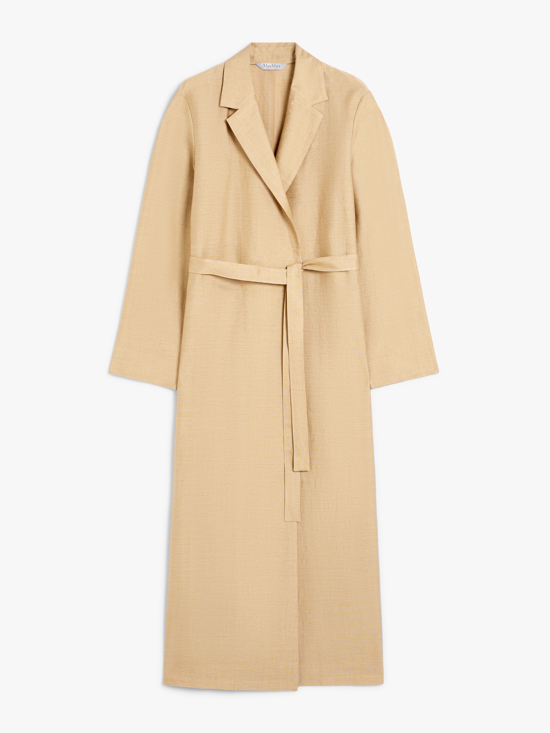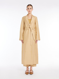 DETAILS Long overcoat in washed linen and silk blend canvas, featuring a wrap silhouette with lapel collar, set-in sleeves with slits at the cuffs and inset pockets at the sides. Finished with a centre-back slit and fastened with a matching belt, highlighting the waistline. COMPOSITION AND CARE 47% flaxlinen, 39% silk, 14% polyamide. Do not wash; do not bleach; do not tumble dry; cool iron; professionally dry clean perchloroethylene - mild process; do not wet clean. Distributed by Max Mara S.r.l., registered office in Reggio Emilia (Italy), Via Giulia Maramotti 4, 42124 (IT)