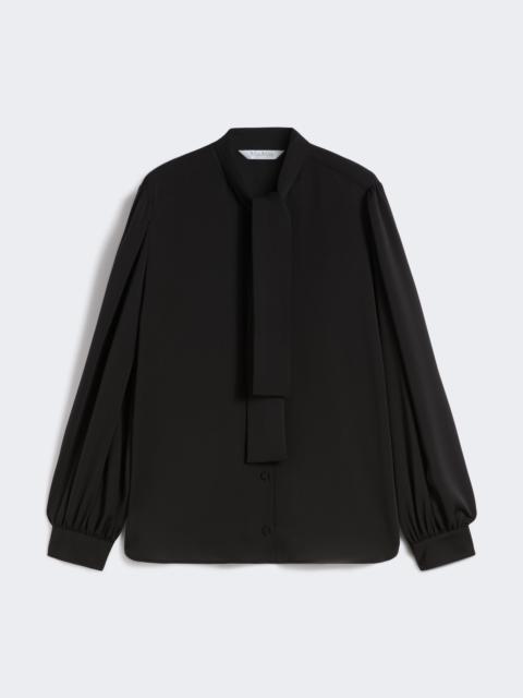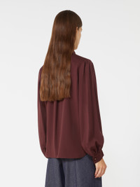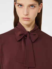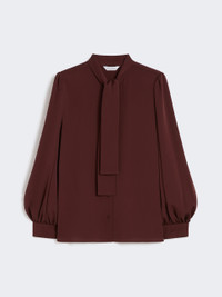 DETAILS Shirt with foulard neckline tied at the front with a bow. Washed, heavy pure-silk charmeuse shirt Long sleeves with slight volume on the shoulder and hem Shirt cuff with Monogram button Front fastening with visible buttons Rounded hem with side slits Yoke seam with gathered motif on the back COMPOSITION AND CARE 100% silk. Do not wash; do not bleach; do not tumble dry; cool iron; professionally dry clean perchloroethylene - mild process; do not wet clean.; wash the garment while it is fastened.; do not iron the buttons.; protect buttons before washing.; turn the articles inside out before washing. Distributed by Max Mara S.r.l., registered office in Reggio Emilia (Italy), Via Giulia Maramotti 4, 42124 (IT)
