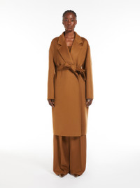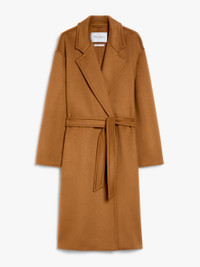 DETAILS Midi wrap coat made of hand-sewn, pure cashmere double cloth. It features a lapel collar, long sleeves with slightly dropped shoulders and slant pockets on the sides. Unlined style, embellished with a tailored pick stitch and centre-back vent. The wrap closure with a matching belt helps accentuate the waist. COMPOSITION AND CARE Fabric 100% cashmere; - except joining thread. Do not wash; do not bleach; do not tumble dry; cool iron; professionally dry clean perchloroethylene - mild process; do not wet clean. Distributed by Max Mara S.r.l., registered office in Reggio Emilia (Italy), Via Giulia Maramotti 4, 42124 (IT)