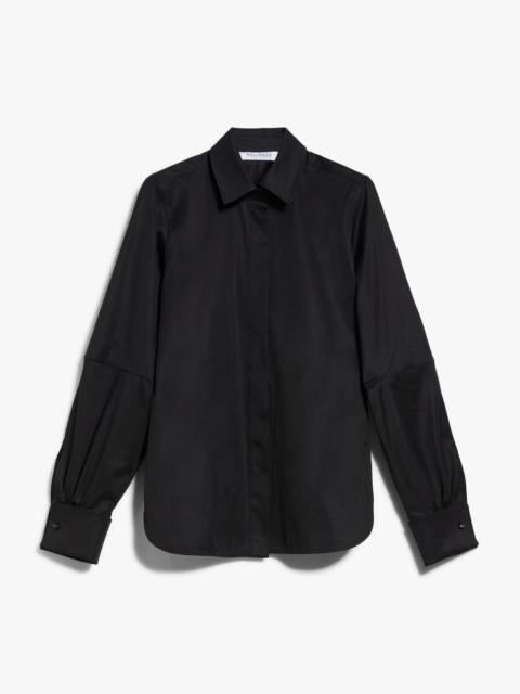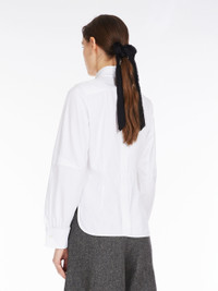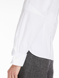 DETAILS Masculine-inspired shirt in stretch cotton twill, interpreted in a modern, feminine version with wide sleeves featuring pleats and customised button cufflink fastenings. Featuring rounded side slits. Concealed button fastening. Length: 65 cm COMPOSITION AND CARE 97% cotton, 3% elastane. Machine wash cold delicate cycle; do not bleach; do not tumble dry; line drying in the shade; cool iron; professionally dry clean perchloroethylene - mild process.; turn the articles inside out before washing.; remove the cufflinks before washing.; contains non-textile parts of animal origin. Distributed by Max Mara S.r.l., registered office in Reggio Emilia (Italy), Via Giulia Maramotti 4, 42124 (IT)