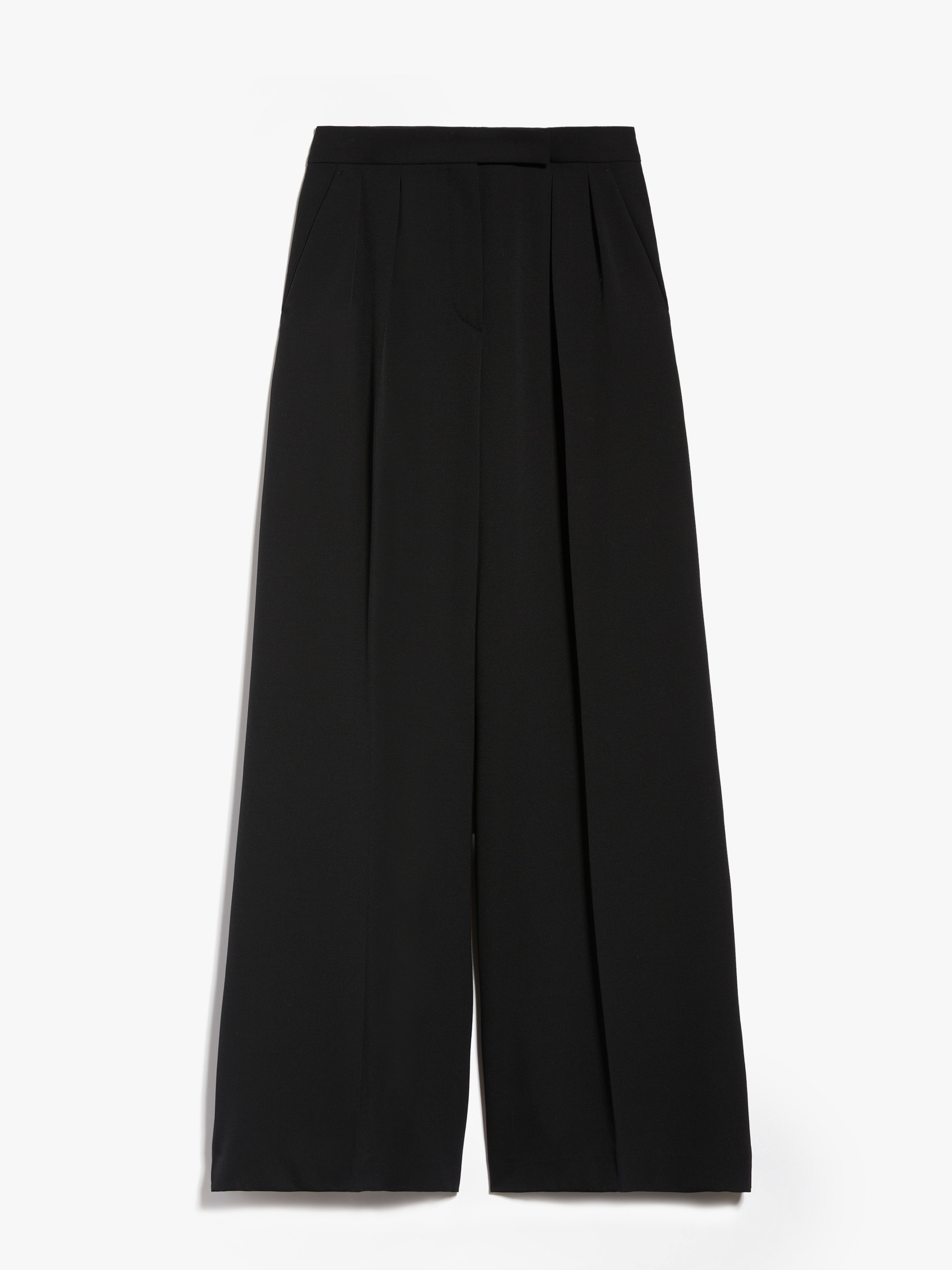 DETAILS Elegant masculine trousers made of granité stretch wool, featuring a wide-leg silhouette, double pleats at the waist and trouser crease. Finished with matching-tone side bands in shiny satin, inset side pockets and small welt pockets on the back. Fastening with high waistband tab, zip fly and small hook. COMPOSITION AND CARE 98% virgin wool, 2% elastane. Do not wash; do not bleach; do not tumble dry; cool iron; professionally dry clean perchloroethylene - mild process; do not wet clean. Distributed by Max Mara S.r.l., registered office in Reggio Emilia (Italy), Via Giulia Maramotti 4, 42124 (IT)