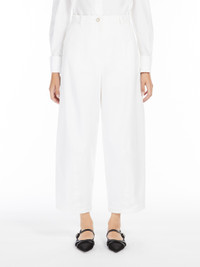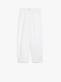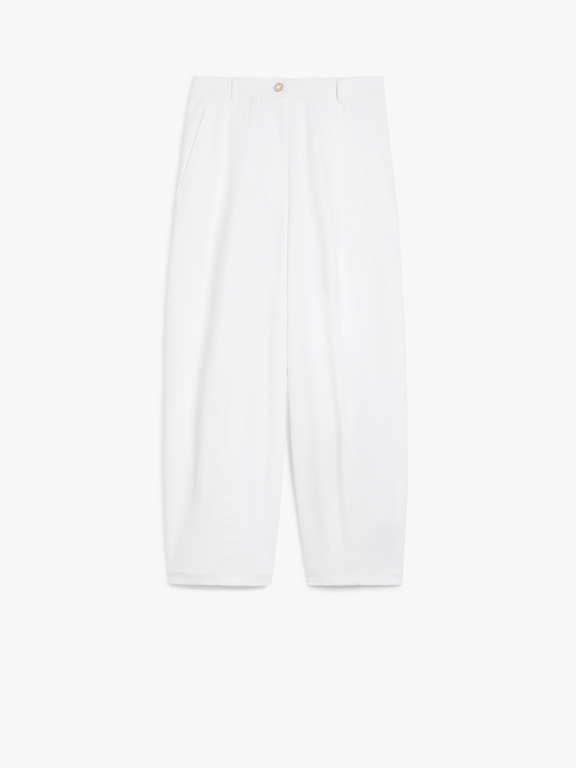 DETAILS Baggy trousers in stretch cotton twill, featuring a wide-leg silhouette, slightly long crotch and pleated motif at the hem. Cropped at the ankle, with large slant pockets on the sides and patch pockets on the back, the left one customised with tone-on-tone M Monogram embroidery. Concealed zip fastening and visible button. COMPOSITION AND CARE Fabric 94% cotton, 6% elastane; - exclusive of embroideries. Do not wash; do not bleach; do not tumble dry; cool iron; professionally dry clean perchloroethylene - mild process; do not wet clean.; put this item into a string bag before washing it.; wash the garment while it is fastened.; protect buttons before washing.; turn the articles inside out before washing. Distributed by Max Mara S.r.l., registered office in Reggio Emilia (Italy), Via Giulia Maramotti 4, 42124 (IT)