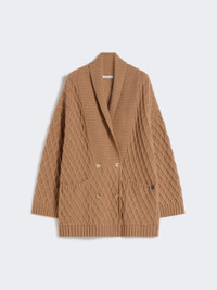DETAILS Double-breasted cardigan in an all-over cable-pattern knit. Pure camel yarn cardigan Comfortable fit and straight lines Wide, ribbed shawl collar Long sleeves with dropped shoulders Front fastening with horn buttons Patch pockets Leather logo label on the right pocket COMPOSITION AND CARE 100% camelwool. Hand wash cold (40°c max); do not bleach; do not tumble dry; flat drying in the shade; cool iron; professionally dry clean perchloroethylene - mild process; do not wet clean.; iron with a cloth between.; using neutral detergent. Distributed by Max Mara S.r.l., registered office in Reggio Emilia (Italy), Via Giulia Maramotti 4, 42124 (IT)