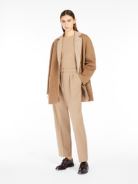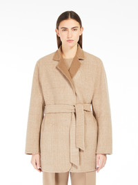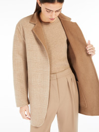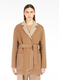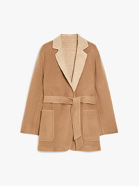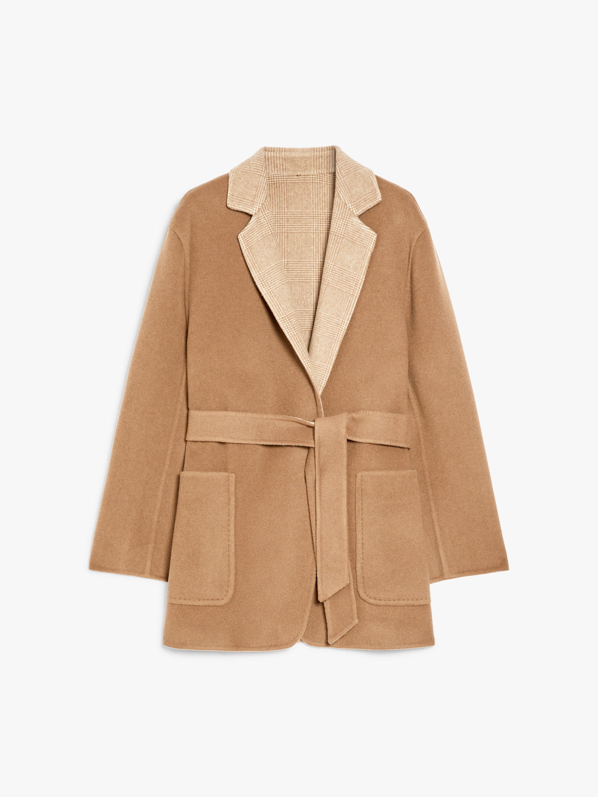 DETAILS Reversible jacket with an oversized fit, made of double wool and cashmere fabric. One side is solid colour, with patch pockets, the other features a classic Prince of Wales design. Unlined model with lapel collar, long set-in sleeves and thread loops at the waist. The matching belt fastening accentuates the feminine silhouette. COMPOSITION AND CARE Fabric 70% virgin wool, 30% cashmere; - except joining thread. Do not wash; do not bleach; do not tumble dry; cool iron; professionally dry clean perchloroethylene - mild process; do not wet clean. Distributed by Max Mara S.r.l., registered office in Reggio Emilia (Italy), Via Giulia Maramotti 4, 42124 (IT)