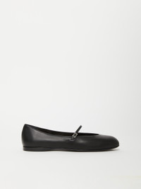 DETAILS Ballet flats in soft, semi-gloss nappa, featuring a rounded toe, almond-shaped topline, and strap on the instep with side buckle featuring metallic double M logo. Silk-satin lining and padded insole covered in leather. Sole in natural pumice leather, with non-slip M Monogram motif. COMPOSITION AND CARE Upper in lamb leather; lining in 72% viscose, 28% silk; sole in leather. Distributed by Max Mara S.r.l., registered office in Reggio Emilia (Italy), Via Giulia Maramotti 4, 42124 (IT)