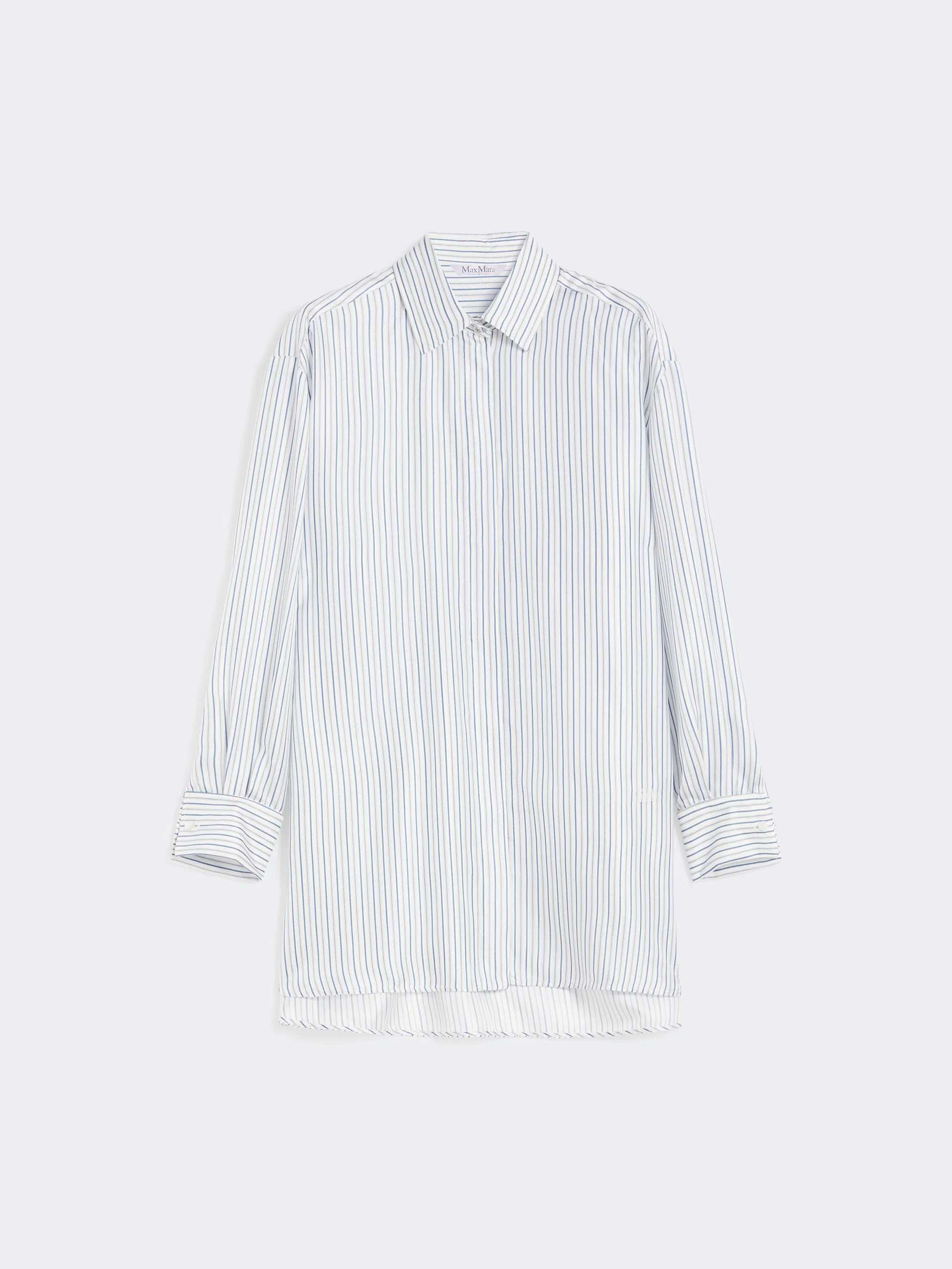 DETAILS Short, masculine-inspired shirt dress with embroidered M Monogram logo at the front hem. Pure silk twill dress with striped print Oversized volume Shirt collar and long sleeves Concealed front fastening High cufflink cuffs Rounded hemline longer at the back, with side slits Yoke seam with slightly gathered motif on the back COMPOSITION AND CARE 100% silk. Do not wash; do not bleach; do not tumble dry; cool iron; professionally dry clean perchloroethylene - mild process; do not wet clean.; wash the garment while it is fastened.; do not iron the buttons.; protect buttons before washing.; turn the articles inside out before washing.; remove the cufflinks before washing. Distributed by Max Mara S.r.l., registered office in Reggio Emilia (Italy), Via Giulia Maramotti 4, 42124 (IT)