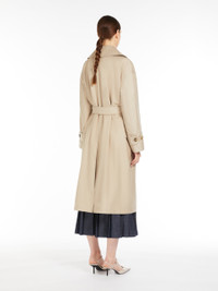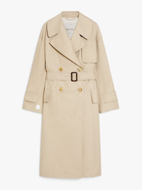 DETAILS Slightly oversized, long, double-breasted trench coat made of a water-repellent cotton-blend twill. The style features a wide lapel collar, low-set sleeves with adjustable cuff straps, and patch pockets with flaps on the front. Finished with an asymmetrical front storm flap on the left side as worn and a central vent at the back. The matching belt with leather buckle accentuates the silhouette. Semi-lined in taffeta with jacquard logo ribbon details. Visible button fastening. The main fabric contains at least 50% cotton fibre grown according to organic farming standards. COMPOSITION AND CARE Fabric 66% cotton, 34% polyester; lining 100% polyester. Machine wash cold delicate cycle; do not bleach; do not tumble dry; line drying in the shade; cool iron; professionally dry clean perchloroethylene - mild process.; wash the garment while it is fastened.; don’t iron the labels.; do not iron the buttons.; protect buttons before washing.; turn the articles inside out before washing.; remove the buckle before washing.; contains non-textile parts of animal origin. Distributed by Max Mara S.r.l., registered office in Reggio Emilia (Italy), Via Giulia Maramotti 4, 42124 (IT)