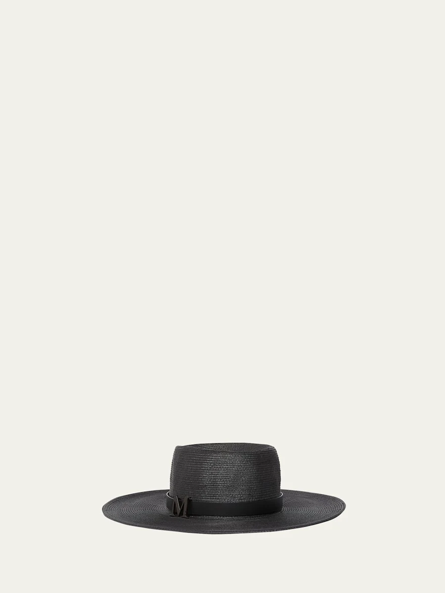 Max Mara "Musette" fedora in paper, polyester, and cotton Geometric crown Leather belt on break; logo emblem Flat, wide brim Made in Italy