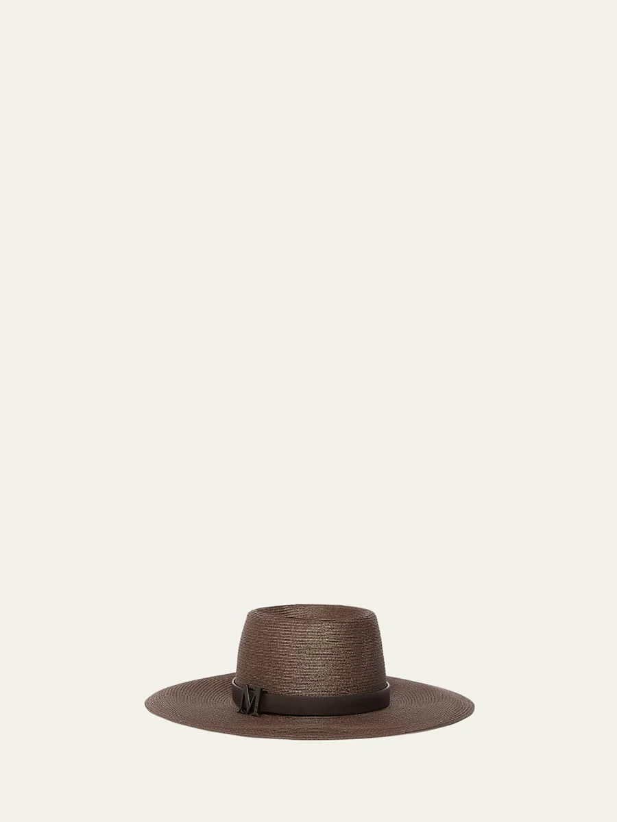 Max Mara "Musette" fedora in paper, polyester, and cotton Geometric crown Leather belt on break; logo emblem Flat, wide brim Made in Italy