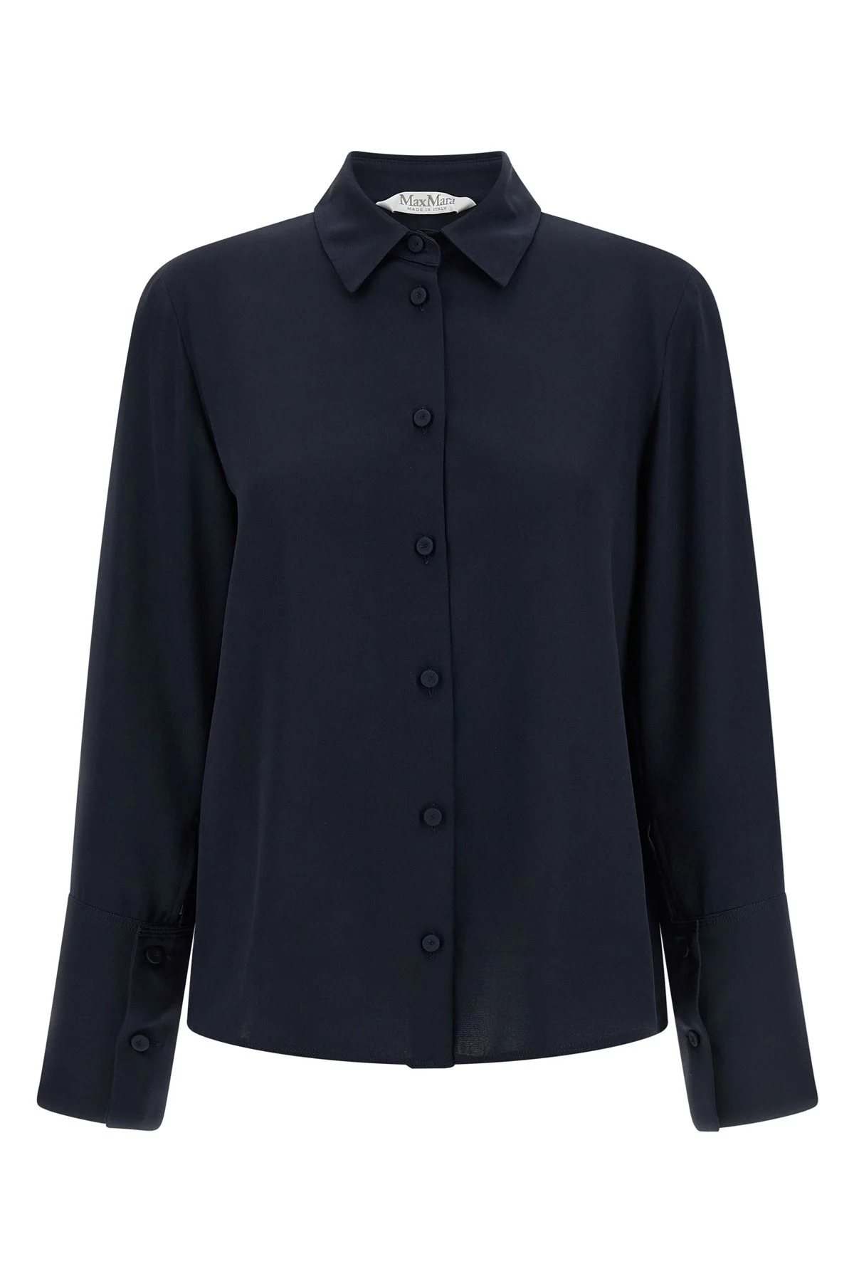 cod. 2611111018600017 'MxpVoliera' stretch silk crepe de Chine shirt with front button closure, long sleeves with maxi cuffs, and asymmetrical hem. Color: Blue Size & Fit: true to size fit Composition: 93% silk, 7% elastane Made in: Italy