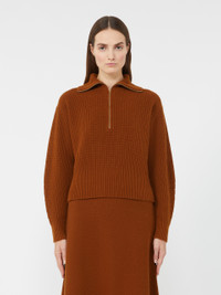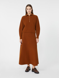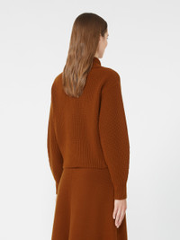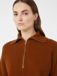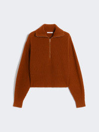 DETAILS Boxy-fit cropped jumper. Fisherman’s rib-knit wool and cashmere jumper Loose fit High neck with metal half zip and custom slider Long sleeves with dropped shoulders COMPOSITION AND CARE 70% wool, 30% cashmere. Hand wash cold (40°c max); do not bleach; do not tumble dry; flat drying in the shade; cool iron; professionally dry clean perchloroethylene - mild process; do not wet clean.; iron with a cloth between.; using neutral detergent. Distributed by Max Mara S.r.l., registered office in Reggio Emilia (Italy), Via Giulia Maramotti 4, 42124 (IT)