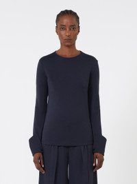 DETAILS Basic long-sleeved T-shirt featuring shirt-style details. T-shirt in pure wool interlock jersey Comfortable, snug fit Crew neckline Shirt cuff with mother-of-pearl button on the side Straight hem COMPOSITION AND CARE 100% wool. Hand wash cold (40°c max); do not bleach; do not tumble dry; drip line drying in the shade; cool iron; professionally dry clean perchloroethylene - mild process; do not wet clean.; iron with a cloth between.; using neutral detergent. Distributed by Max Mara S.r.l., registered office in Reggio Emilia (Italy), Via Giulia Maramotti 4, 42124 (IT)