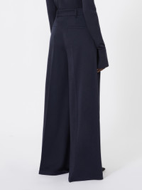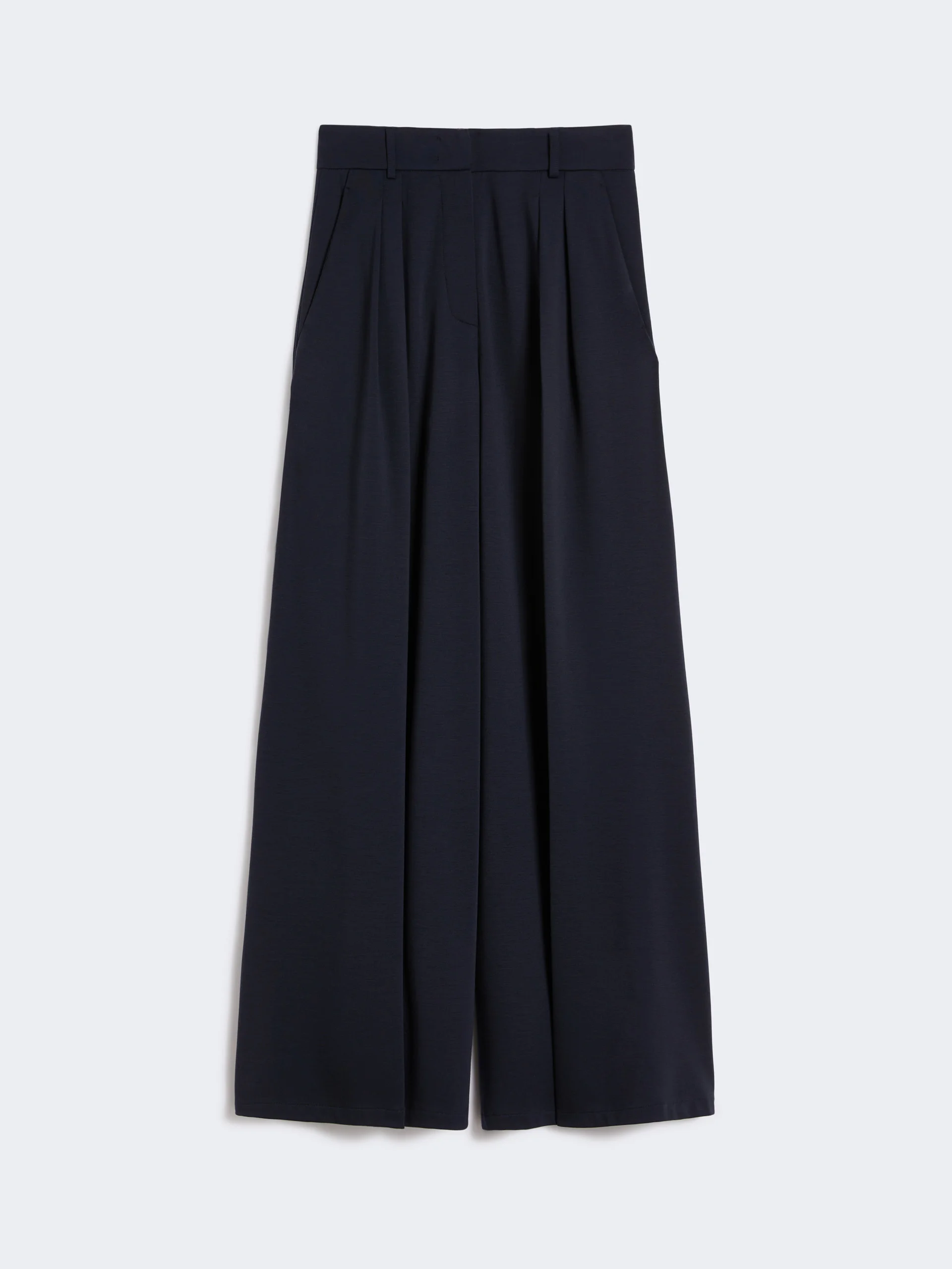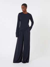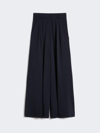 DETAILS Palazzo trousers with double pleats on the waist front that add volume. Pure wool jersey trousers Wide leg Fastening with a wide waistband tab, zip fly and small hook Slant pockets at the sides Welt pockets at the back Belt loops and trouser crease COMPOSITION AND CARE 100% wool. Hand wash cold (40°c max); do not bleach; do not tumble dry; drip line drying in the shade; cool iron; professionally dry clean perchloroethylene - mild process; do not wet clean.; iron with a cloth between.; using neutral detergent.; don’t rub.; turn the articles inside out before washing.; to be ironed on reverse. Distributed by Max Mara S.r.l., registered office in Reggio Emilia (Italy), Via Giulia Maramotti 4, 42124 (IT)
