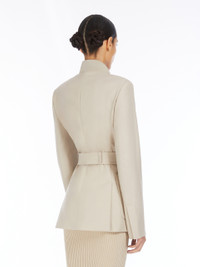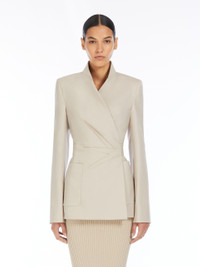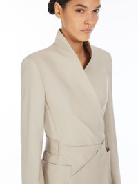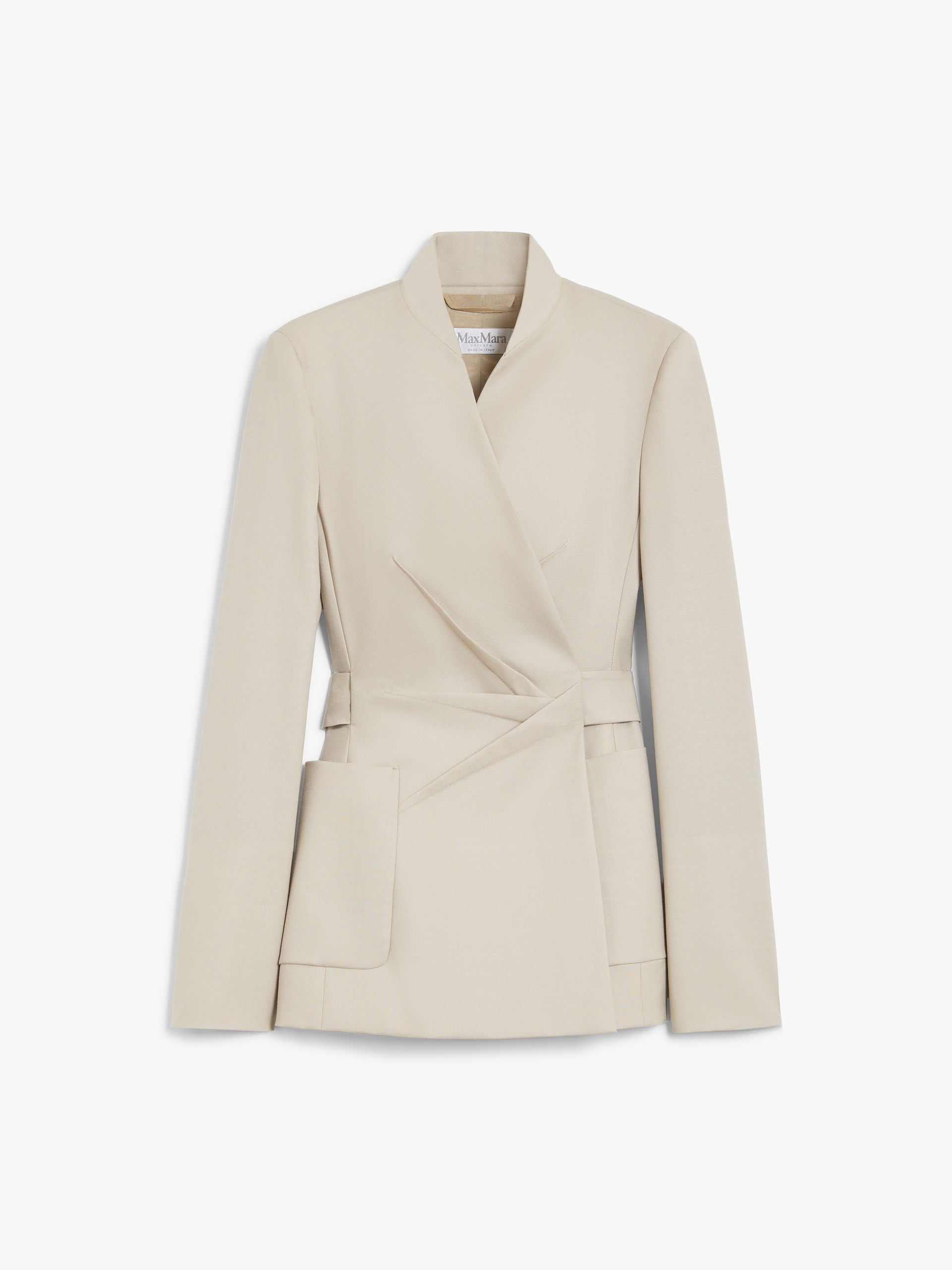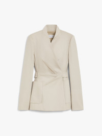 DETAILS Women’s blazer in a luxurious combination of wool, mohair and silk. Lined garment featuring a silhouette wrapped over to the left side with a sash tied at the back, a mandarin collar and long set-in sleeves with a deep vent at the cuff. Featuring stitched pleat motif on the front, patch pockets and lateral vents at the back. COMPOSITION AND CARE Fabric 71% virgin wool, 18% mohair, 11% silk; lining 54% viscose, 46% cotton. Do not wash; do not bleach; do not tumble dry; cool iron; professionally dry clean perchloroethylene - mild process; do not wet clean. Distributed by Max Mara S.r.l., registered office in Reggio Emilia (Italy), Via Giulia Maramotti 4, 42124 (IT)