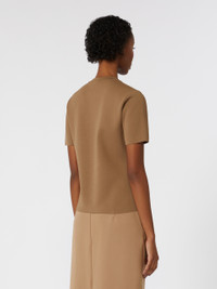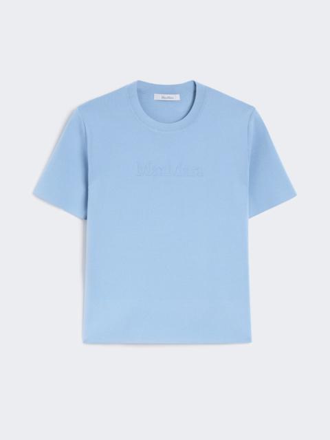DETAILS Crew neck jumper, customised with Max Mara 3D lettering embossed on the front. The main fabric of this garment contains raw materials derived from wood cellulose, a fibre produced with respect for the forest Viscose crepe yarn jumper Semi-fitted Ribbed neckline Short set-in sleeves COMPOSITION AND CARE 65% viscose, 35% polyamide. Hand wash cold (40°c max); do not bleach; do not tumble dry; flat drying in the shade; cool iron; professionally dry clean perchloroethylene - mild process; do not wet clean.; iron with a cloth between.; using neutral detergent. Distributed by Max Mara S.r.l., registered office in Reggio Emilia (Italy), Via Giulia Maramotti 4, 42124 (IT)