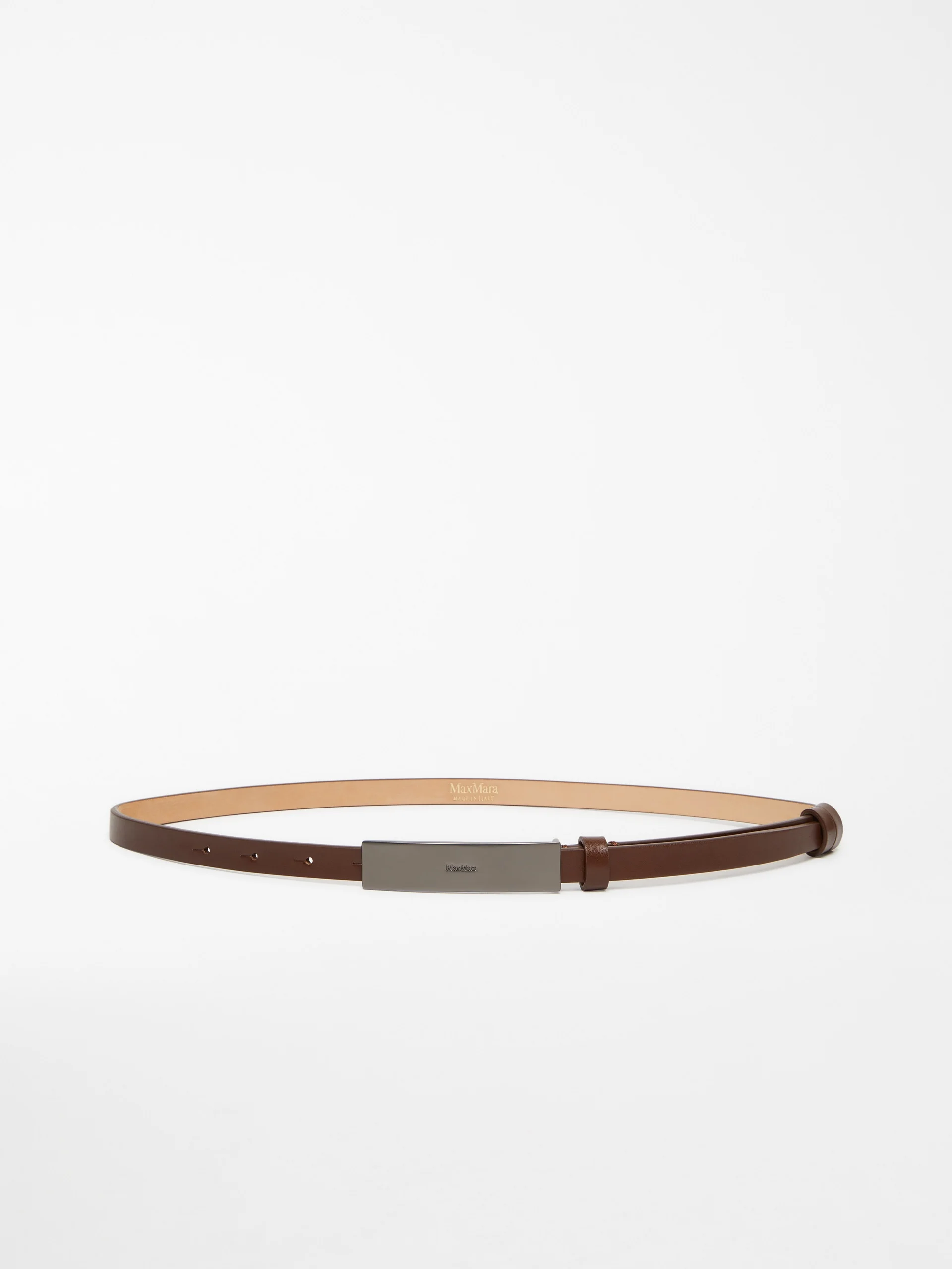 DETAILS Thin flat belt in soft natural calfskin. The design boasts an elongated tip and double belt loop. Fastened via the Max Mara-branded metal plate buckle. Width: 1.5 cm. The accessory comes in a Max Mara branded fabric dust bag. COMPOSITION AND CARE Material belt calf; back cattle. Distributed by Max Mara S.r.l., registered office in Reggio Emilia (Italy), Via Giulia Maramotti 4, 42124 (IT)