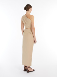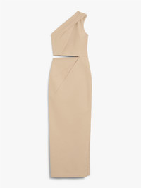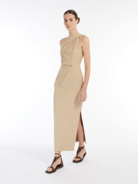 DETAILS Long one-shoulder dress made of washed stretch cotton twill. Unlined, close-fitting garment with asymmetrical stitched pleat motif at the waist on the left side and on the shoulder. Embellished with a cut-out detail on the right hip and a deep side slit at the hem. Invisible zip fastening on the right side. COMPOSITION AND CARE Fabric 94% cotton, 6% elastane; lining 95% acetate, 5% elastane. Hand wash cold; do not bleach; do not tumble dry; line drying in the shade; cool iron; professionally dry clean perchloroethylene - mild process; do not wet clean.; do not iron the buttons.; protect buttons before washing.; contains non-textile parts of animal origin. Distributed by Max Mara S.r.l., registered office in Reggio Emilia (Italy), Via Giulia Maramotti 4, 42124 (IT)