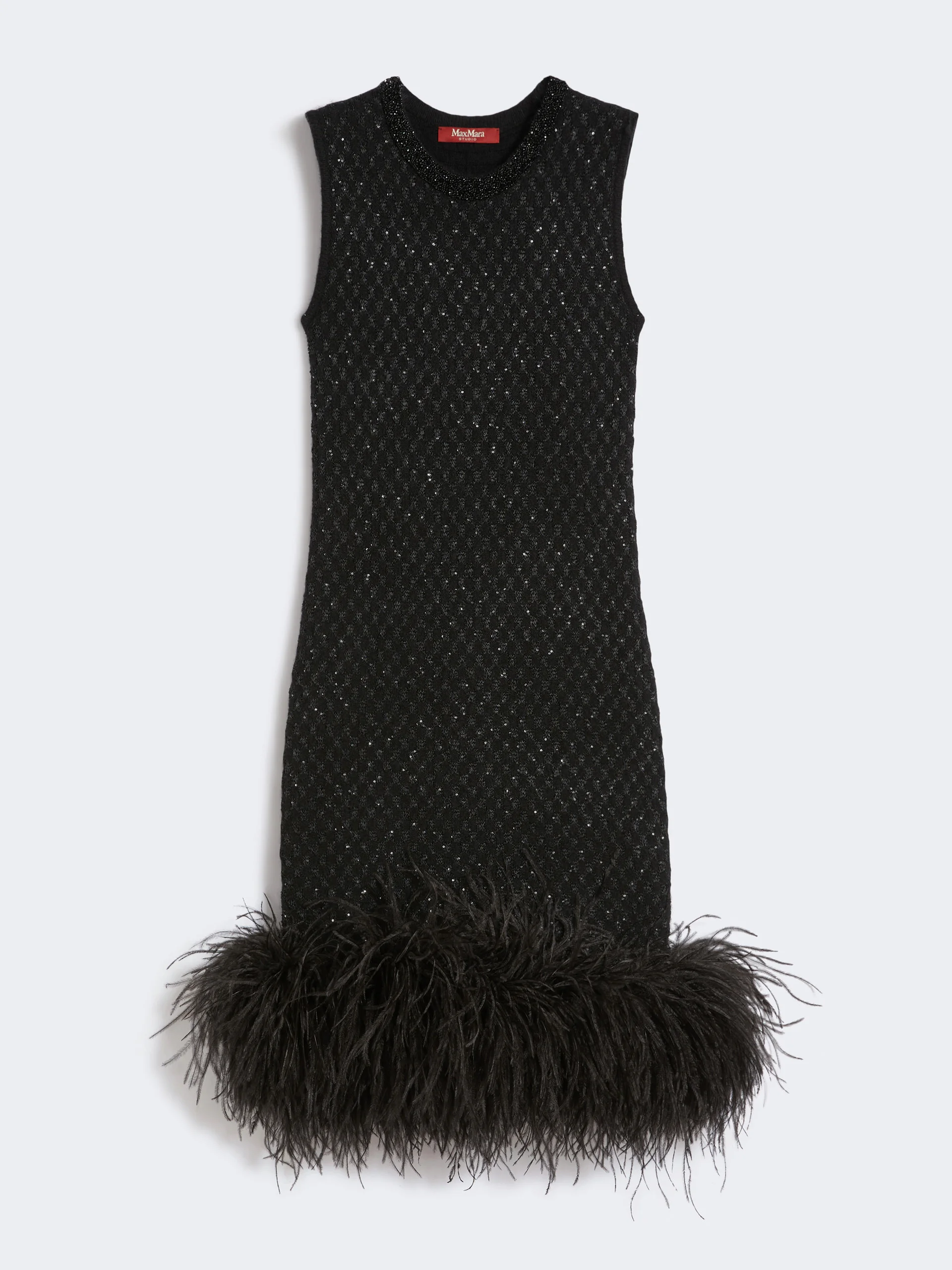 DETAILS Sleeveless mini dress in premium wool and mohair blend yarn, showcasing a clean and sophisticated style. The straight silhouette is elevated by a contrasting feather boa trim along the hemline. Wool and mohair-blend yarn dress All-over jacquard knit-pattern with micro sequins Straight silhouette with regular fit Crew neckline finished with jet embroidery Sleeveless style Cotton and cashmere yarn interior COMPOSITION AND CARE Outer fabric 59% polyester, 19% polyamide, 10% wool, 10% mohair, 2% elastane; joining thread 100% polyamide; inner fabric 95% cotton, 4% cashmere, 1% wool; cock feathers trimmings, turkey; - exclusive of decoration. Hand wash cold (40°c max); do not bleach; do not tumble dry; flat drying in the shade; cool iron; do not dry clean; do not wet clean.; iron with a cloth between.; using neutral detergent.; before cleaning the style remove the accessories. Distributed by Max Mara S.r.l., registered office in Reggio Emilia (Italy), Via Giulia Maramotti 4, 42124 (IT)
