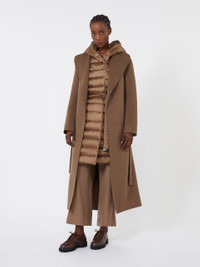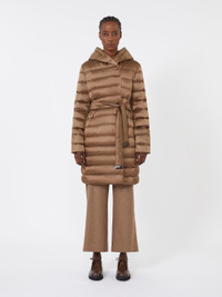 DETAILS Reversible midi down jacket with hood. Supplied with two belts: one in a matching fabric, the other in technical webbing and leather. Down jacket in iridescent, water-repellent, quilted satin Smooth taffeta lining The sleeves can be worn long or three-quarter length Single-button and strap fastening on the collar Delivered in a Cube Bag dust cover, ideal for travelling Customisable with collection accessories, sold separately Goose-down padding COMPOSITION AND CARE Quilted coat fabric 57% polyamide, 43% polyester; inner fabric 100% polyamide; with quilting virgin goose-down; care case 57% polyamide, 43% polyester; with belt in cattle; with belt in 100% polyamide. Quilted coat: machine wash cold delicate cycle; do not bleach; do not tumble dry; line drying in the shade; cool iron; professionally dry clean perchloroethylene - mild process.; Wash the garment while it is fastened.; Don’t iron the labels.; Remove the belt before washing.; Contains non-textile parts of animal origin. Belt: do not wash; do not bleach; do not tumble dry; do not iron; do not dry clean; do not wet clean. Distributed by Max Mara S.r.l., registered office in Reggio Emilia (Italy), Via Giulia Maramotti 4, 42124 (IT)