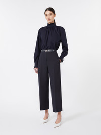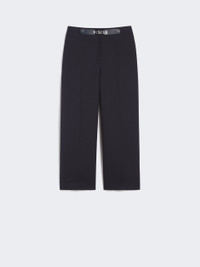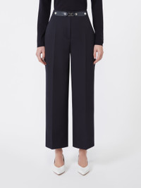 DETAILS Cropped ankle trousers with leather strap and metal M Monogram detail at the centre front. Washed technical fabric trousers Slim fit with high waist Front fastening with concealed zip Side inset pockets Trouser crease COMPOSITION AND CARE Fabric 100% polyester; with details in cattle. Hand wash cold (40°c max); do not bleach; do not tumble dry; line drying in the shade; cool iron; professionally dry clean perchloroethylene - mild process; do not wet clean.; wash the garment while it is fastened.; do not iron the real leather details.; protect buttons before washing.; turn the articles inside out before washing.; remove leather parts before washing.; contains non-textile parts of animal origin. Distributed by Max Mara S.r.l., registered office in Reggio Emilia (Italy), Via Giulia Maramotti 4, 42124 (IT)
