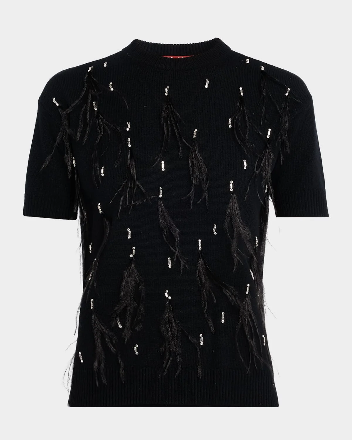 This knit "Oblo" sweater from Max Mara is adorned with crystal accents and fluttering feathers Ribbed finishes on the collar, cuffs, and hem Crew neckline Short sleeves Relaxed fit Pullover style Wool/cashmere Hand wash Imported