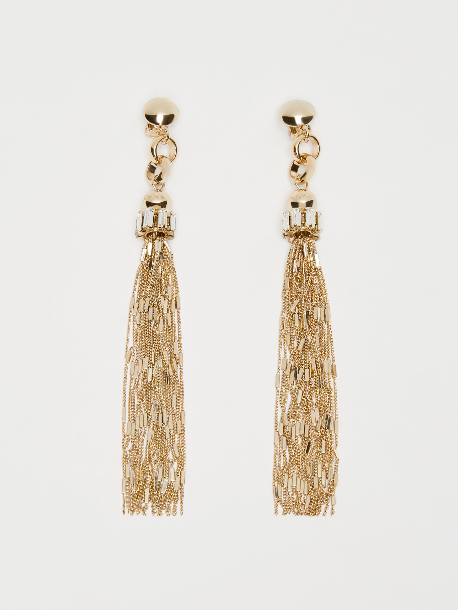 DETAILS Pendant earrings consisting of geometric elements and long multi-strand tassels at the bottom. Embellished with crystal details. COMPOSITION AND CARE Style in metal; with details in acrylonitrile butadiene styrene (abs), glass. Distributed by Max Mara S.r.l., registered office in Reggio Emilia (Italy), Via Giulia Maramotti 4, 42124 (IT)