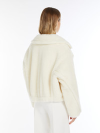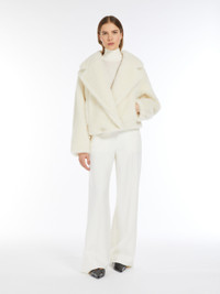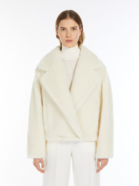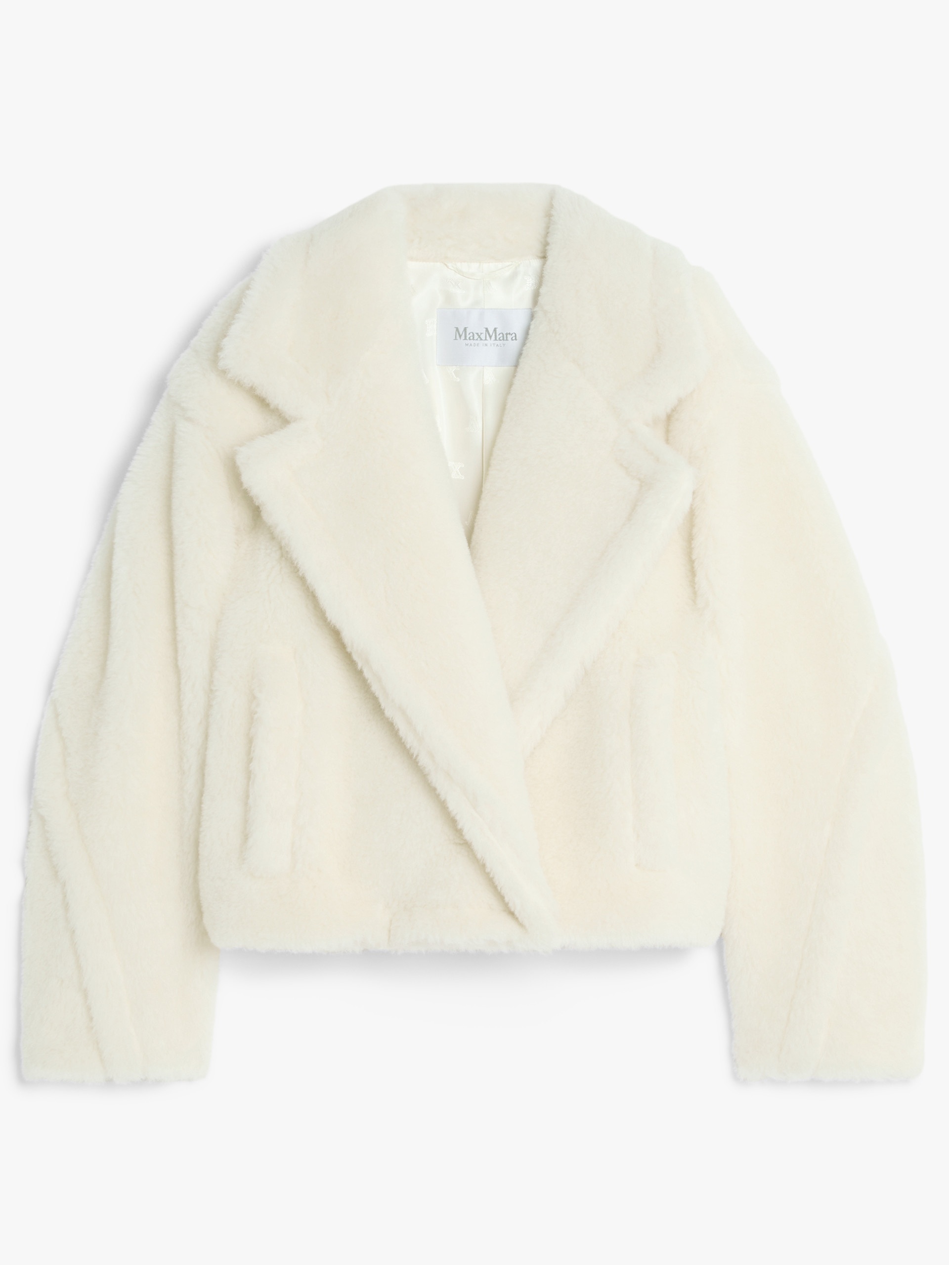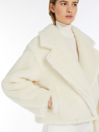 DETAILS Cropped jacket in the iconic Teddy fabric of alpaca and wool on a silk base, featuring an oversized silhouette with a gathered waist at the back and leather straps at the sides. The style features a wide lapel collar, long, low-set sleeves and welt pockets. Lined in Monogram jacquard fabric. Double-breasted fastening with buttons. COMPOSITION AND CARE Jersey fabric 62% alpaca, 26% virgin wool, 12% silk; lining 100% viscose. Do not wash; do not bleach; do not tumble dry; do not iron; professionally dry clean perchloroethylene - mild process; do not wet clean.; contains non-textile parts of animal origin. Distributed by Max Mara S.r.l., registered office in Reggio Emilia (Italy), Via Giulia Maramotti 4, 42124 (IT)