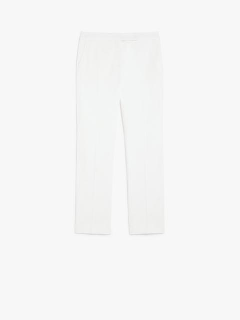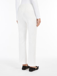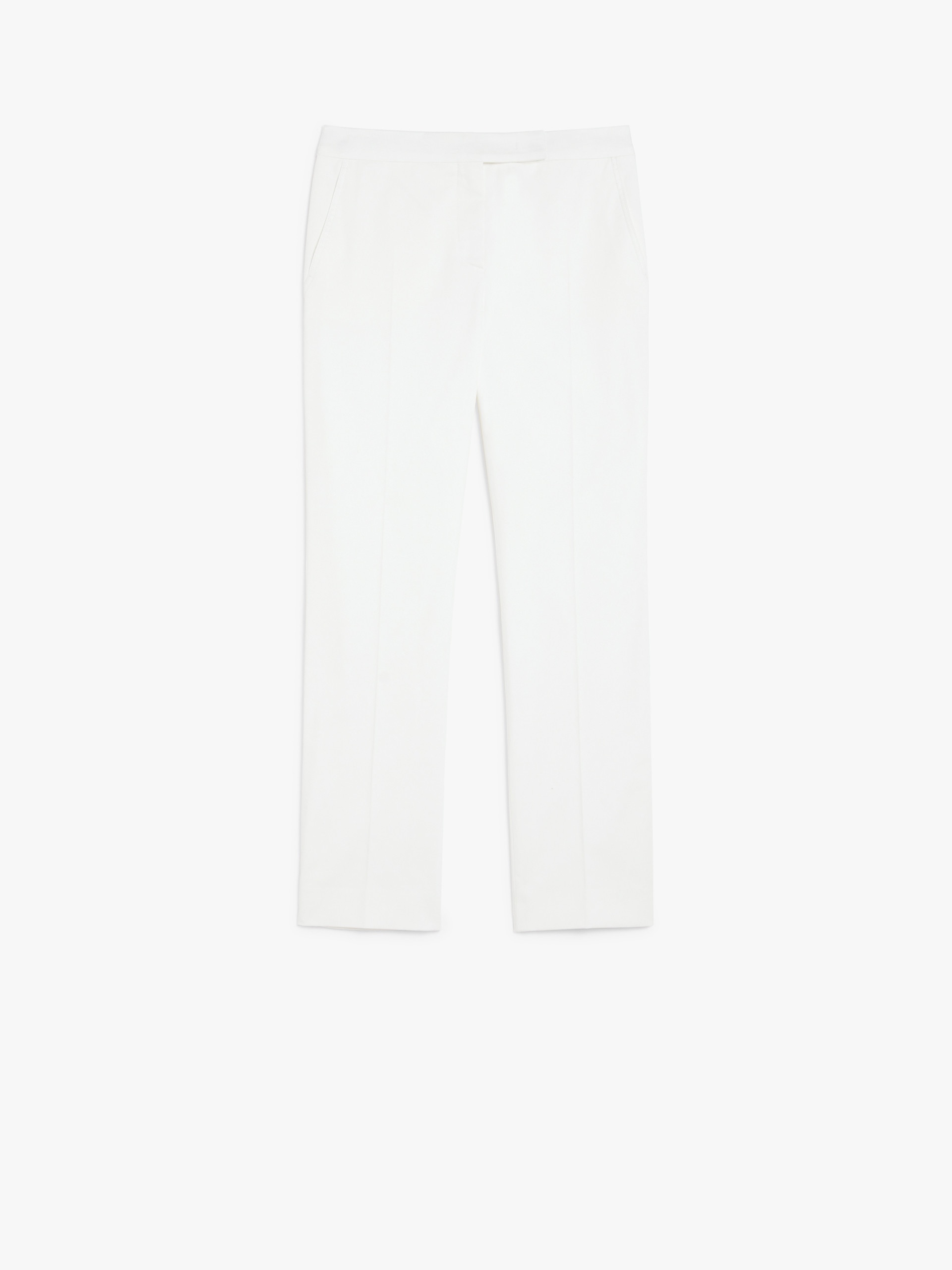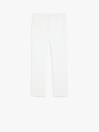 DETAILS Trousers in stretch cotton satin, featuring a straight silhouette slightly narrower and cropped at the ankle. Featuring a trouser crease and slant pockets at the sides. Fastening with a wide waistband tab, zip fly and small hook. COMPOSITION AND CARE 98% cotton, 2% elastane. Machine wash cold delicate cycle; do not bleach; do not tumble dry; line drying in the shade; cool iron; professionally dry clean perchloroethylene - mild process.; protect buttons before washing. Distributed by Max Mara S.r.l., registered office in Reggio Emilia (Italy), Via Giulia Maramotti 4, 42124 (IT)